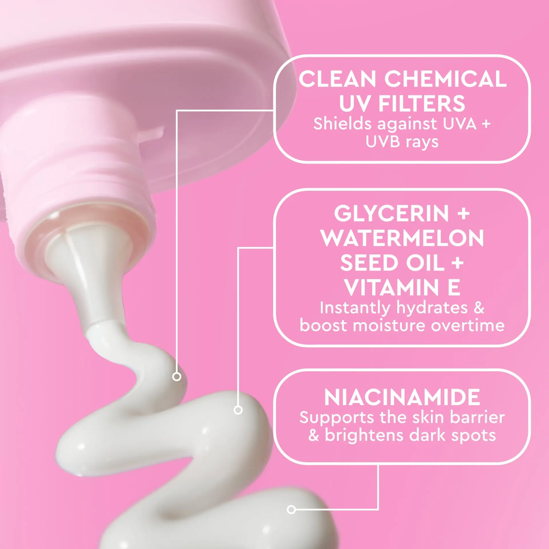 | Ingredients | Water, Butyloctyl Salicylate, Diisopropyl Adipate, Oleyl Erucate, Niacinamide, Glycerin, Cetearyl Alcohol, Diheptyl Succinate, Ammonium Polyacryloyldimethyl Taurate, Phenoxyethanol, Coco-Glucoside, Capryloyl Glycerin/Sebacic Acid Copolymer, Glycine Soja (Soybean) Oil, Xylitylglucoside, Hydroxyacetophenone, Tocopherol, Anhydroxylitol, Fragrance, Citrullus Lanatus (Watermelon) Seed Oil, Pongamia Pinnata Seed Extract, Polyglyceryl-3 Diisostearate, Xylitol, Ethylhexylglycerin, Hyaluronic Acid, Oryza |