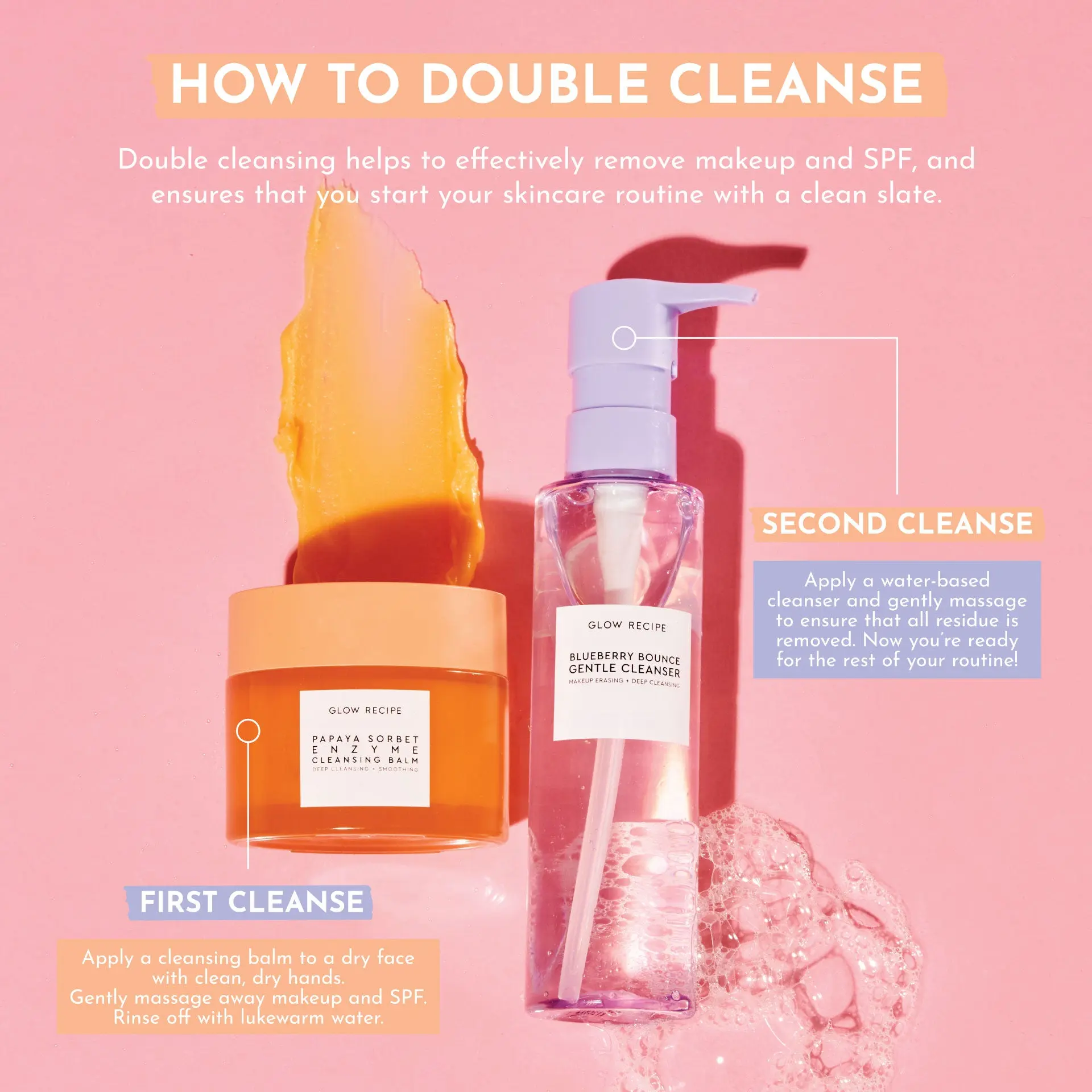Reveal refreshed, clear skin with our Double Cleanse Essentials Skincare Kit. Our Award-winning Papaya Enzyme Cleansing Balm and Blueberry Bounce Gentle Cleanser work together to remove makeup, SPF, and pesky dirt and oils to reveal cleansed and clear skin without stripping skin of moisture.