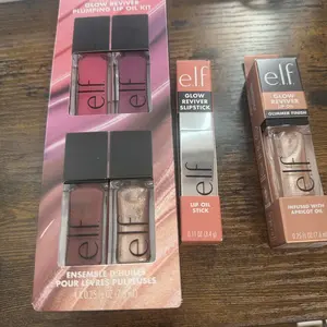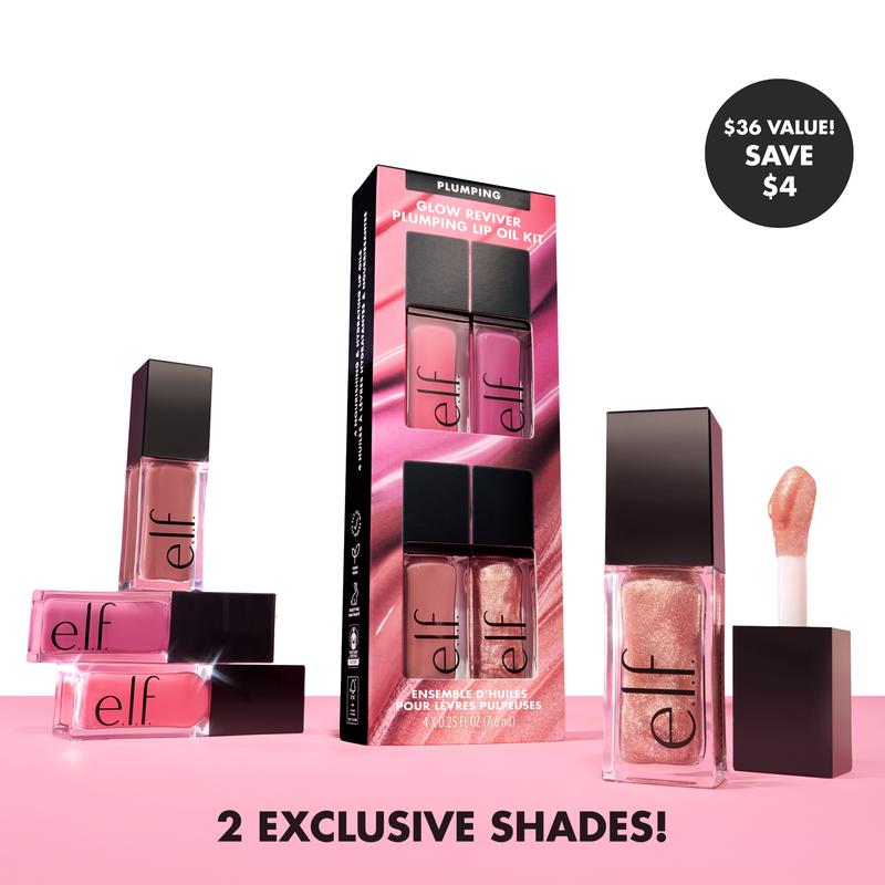 The gift on every e.l.f.ie’s lips. Get 4 Glow Reviver Plumping Lip Oils in one must-have lip kit, featuring 2 exclusive shades you won’t find anywhere else! These pout-plumping, tingling lip oils drench lips in a sheer wash of color, with both glossy and glimmer finishes for a juicy lip look. The comfortable, non-sticky formula is infused with nourishing oils and a fresh minty scent.