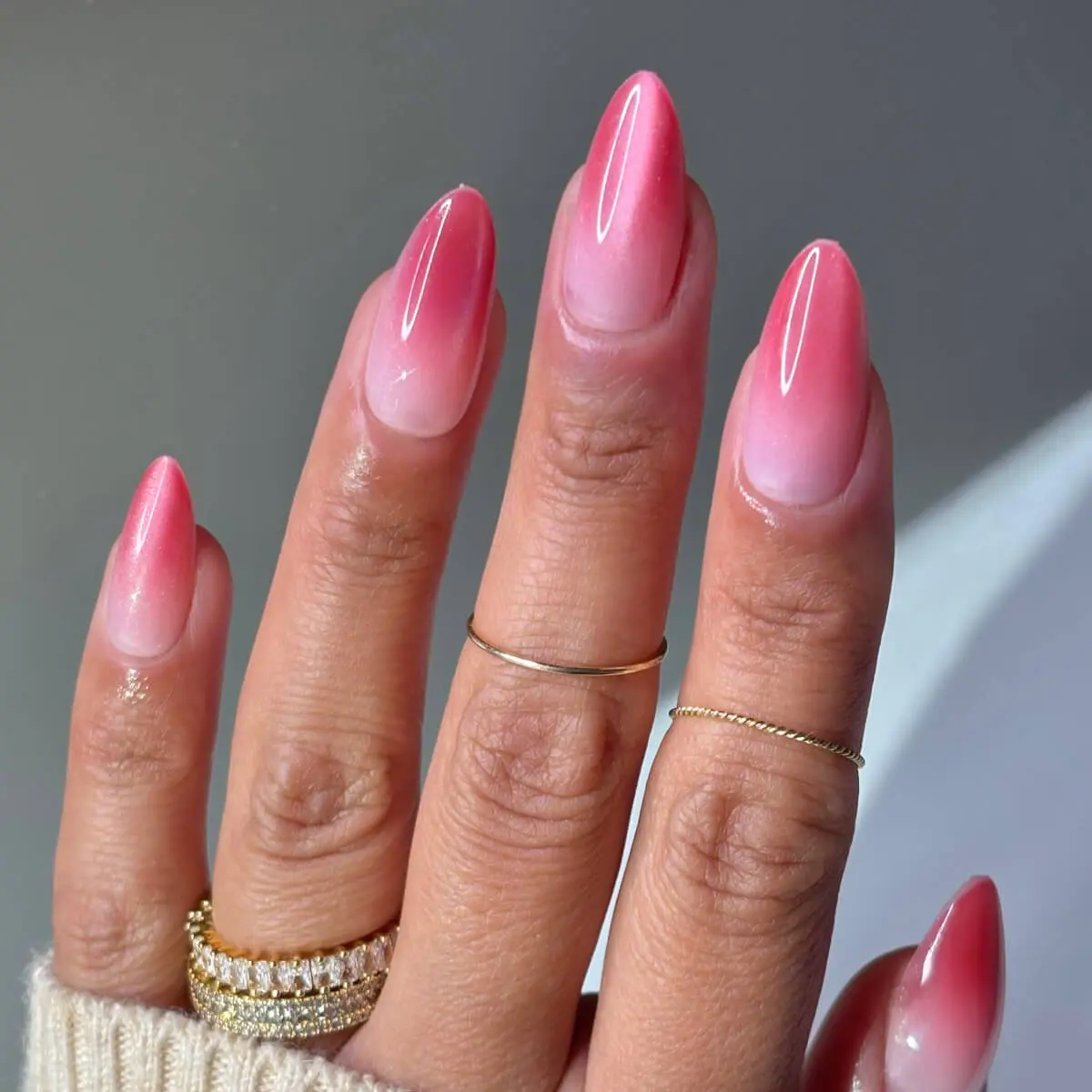 The picture of these nails does not even do them a bit of Justice they are a gorgeous gorgeous pink velvet glitter ombre and a medium almond shape they feel super sturdy and I absolutely cannot wait to wear them.