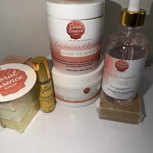 CORAL ESSENCE GLOW UP + is a comprehensive night routine set that includes Turmeric Soap, Exfoliating Cream, Oil, and Glow Up Lotion. This set is designed for a radiant skin. 🌸