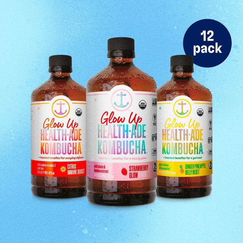 The Health-Ade Kombucha you love with added functional ingredients for a gut-first glow up. Strawberry Glow, Citrus Immune Boost, and Pineapple Belly Reset. Every 12-pack contains 4 bottles of each Glow Up flavor.