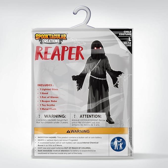 ·Scary Reaper Ghost Halloween Costume includes Black Robe with spooky sleeves, Scary black see-through faceless hood, Creepy long pointed finger gloves, Chain, and a Fade in Fade out light-up glowing glasses