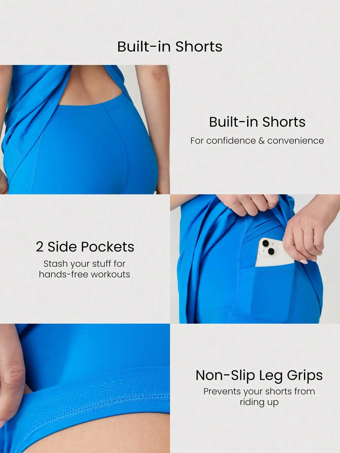 Pro Tip: Designed for light support and low-impact activities, from Downward Dog to dog walking. Go from workout to play in this breathable FeatherFit-Air dress. Crafted in our buttery-soft fabric, made to feel like a second skin, this activewear dress features a scoop neck with wide shoulder straps, an x-strap design at the back. It also boasts built-in shorts with side pockets and an e peekaboo construction that provides concealed pull-down shorts at the back that allow you to use the restroom without removing the entire dress.