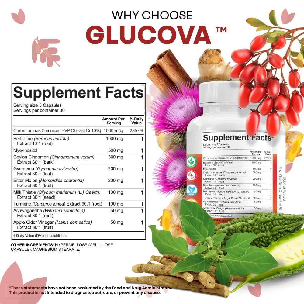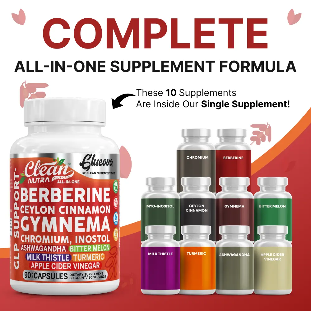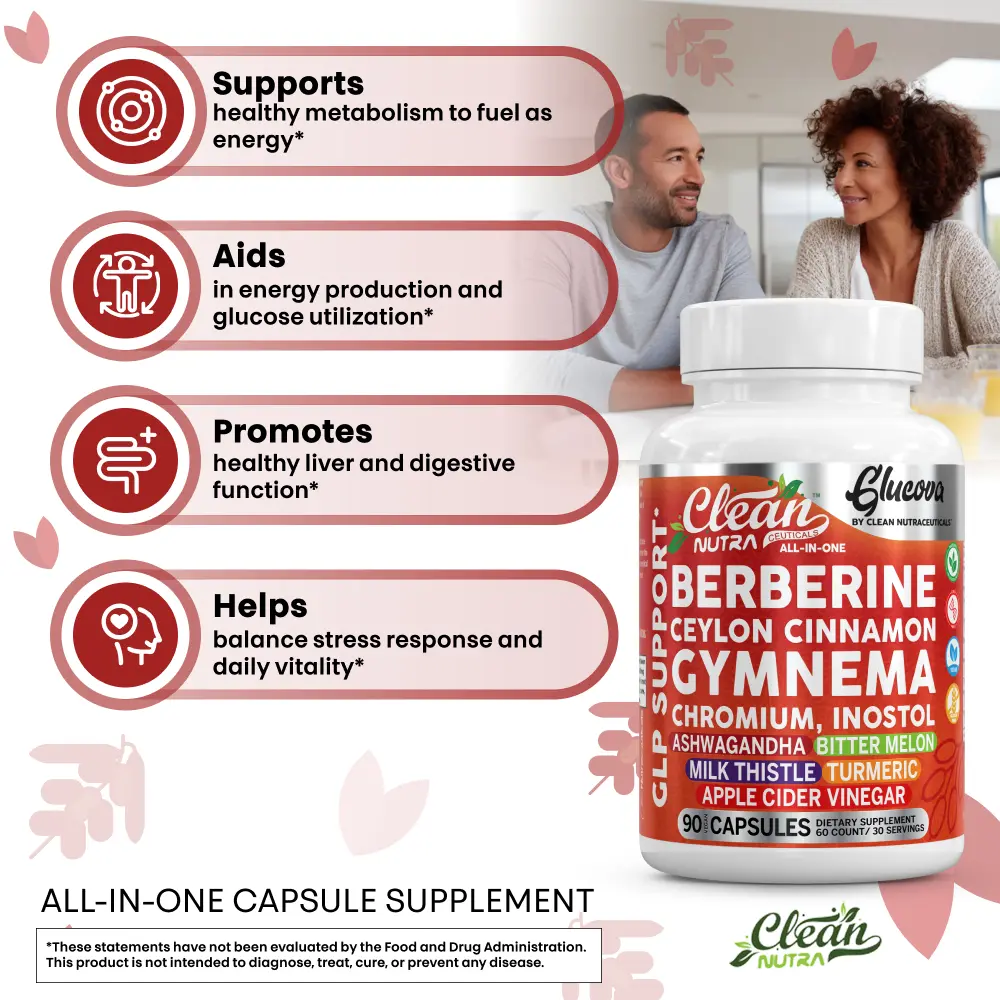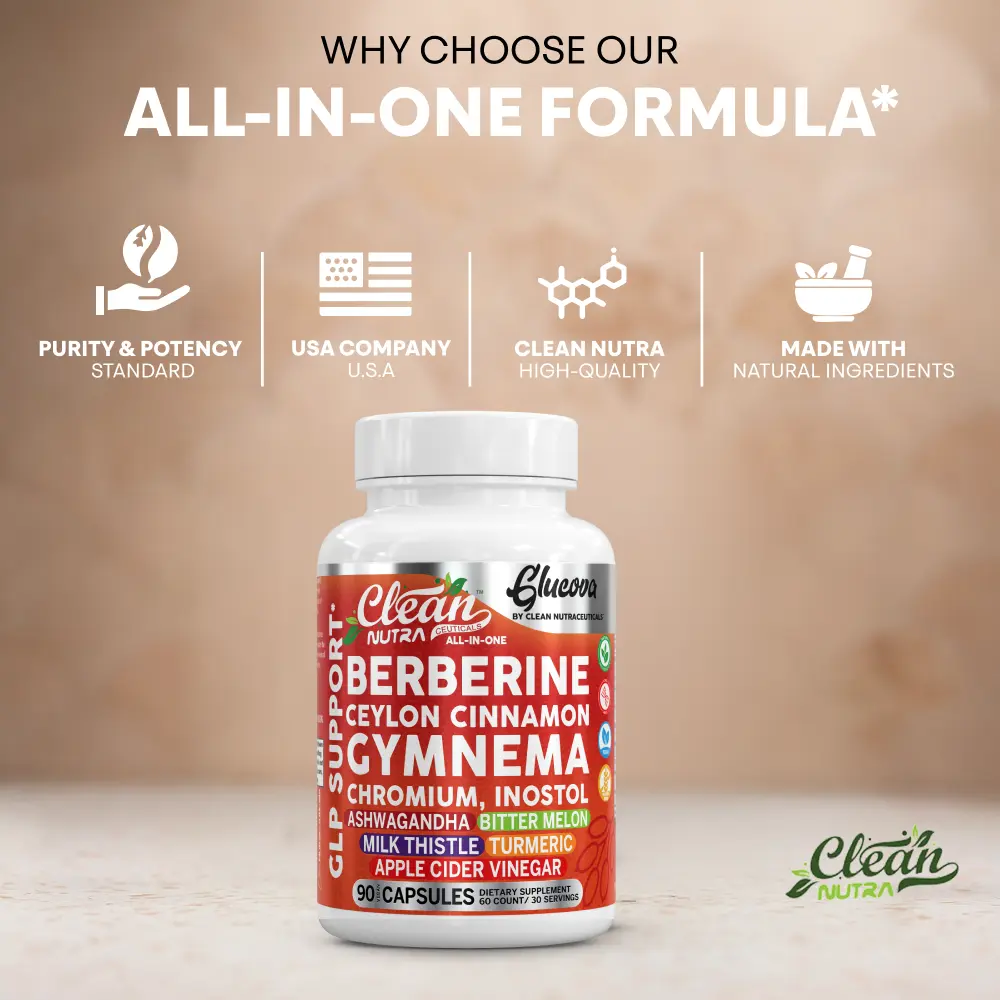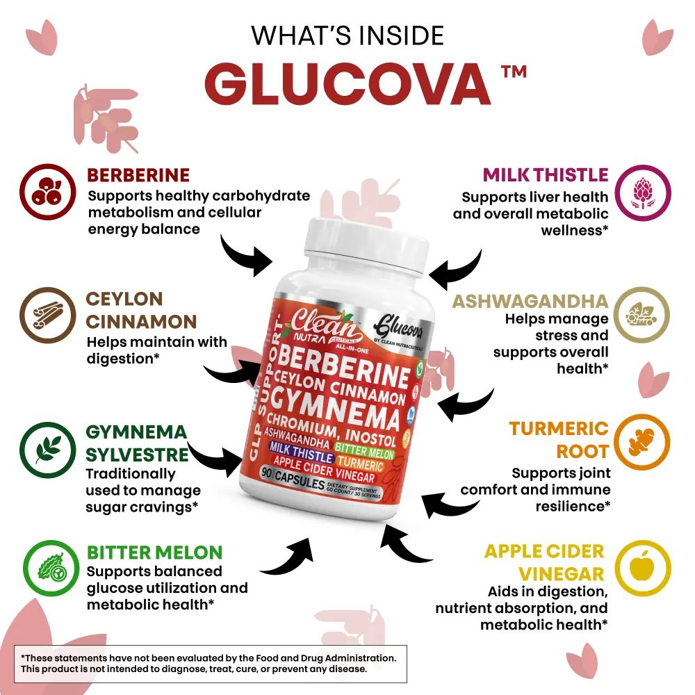 Clean Nutra Glucova is a powerful 10-in-1 all-in-one capsule formula designed to support balanced metabolism, energy, and overall wellness. This advanced supplement combines berberine, Ceylon cinnamon, gymnema sylvestre, turmeric, and more—creating a complete formula for glucose and metabolic support.
