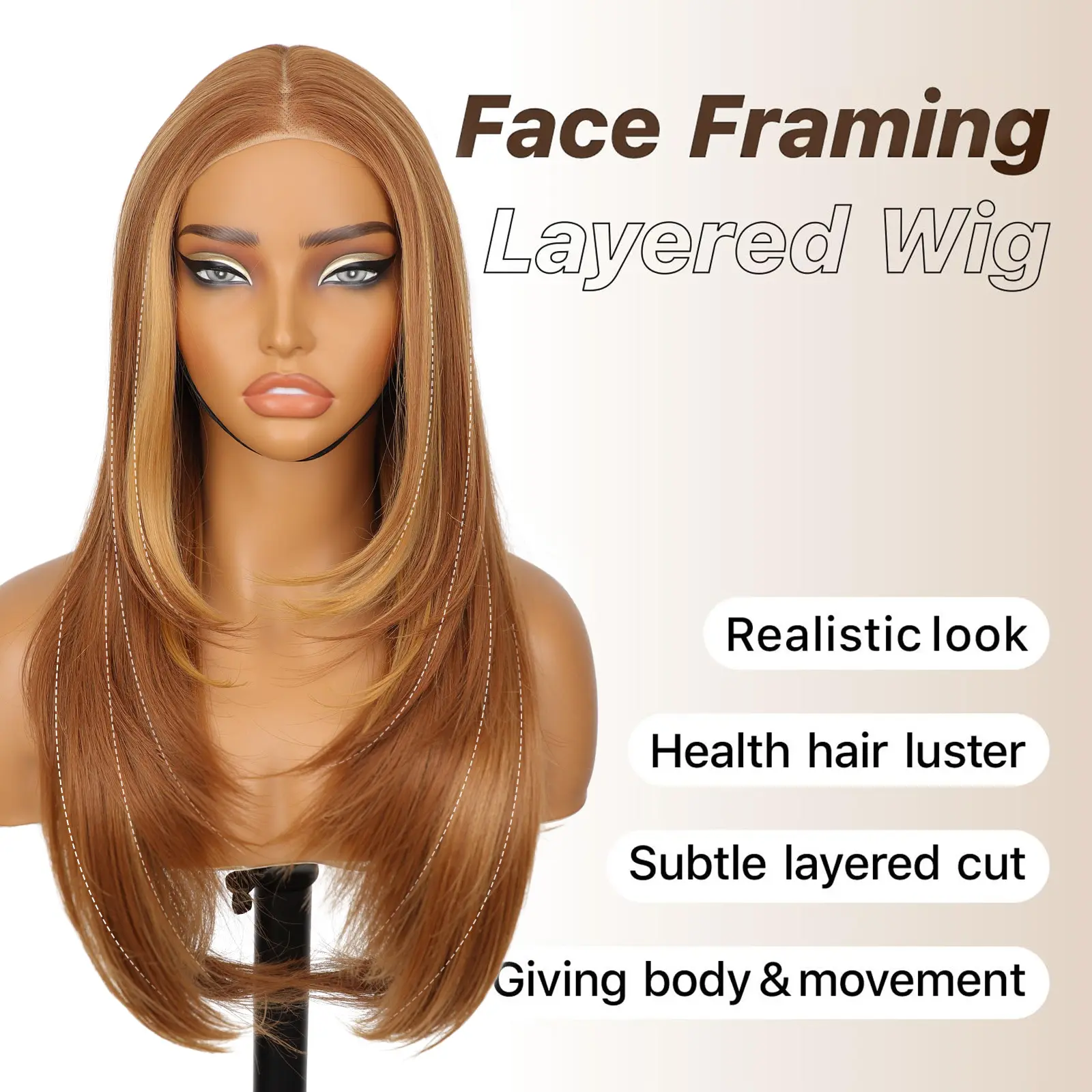 Introducing the [AISI HAIR] 26-inch Wear Wigs! Pre-plucked and pre-cut, these honey blonde wigs with chestnut brown tips are perfect for beginners. The synthetic lace front design offers a natural look. These long, layered straight wigs feature bangs and a middle part. Ideal for women seeking a stylish, versatile hairstyle.