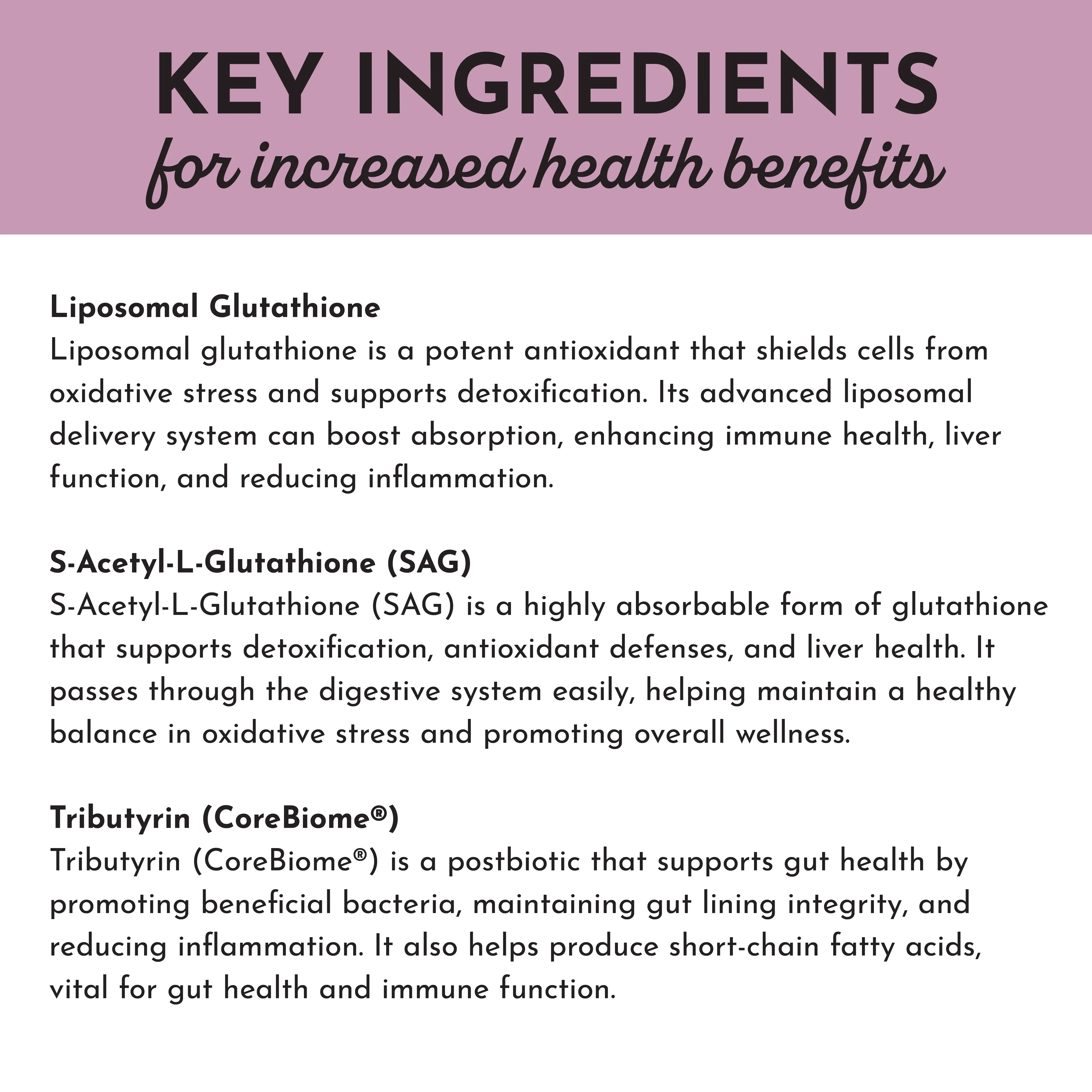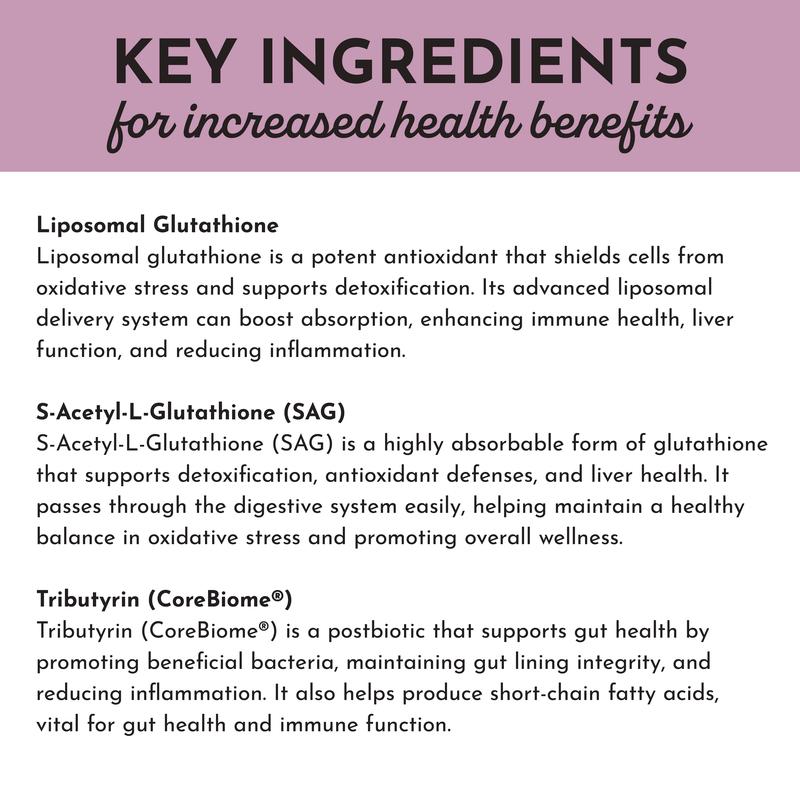 IngredientsL-Glutathione (as Liposomal Glutathione),Tributyrin (as CoreBiome),S-Acetyl-L-Glutathione Other Ingredients: Hypromellose (Vegetable Capsule),Vegetable Cellulose,Organic Bamboo Extract,Coconut MCT Oil,Acacia Fiber