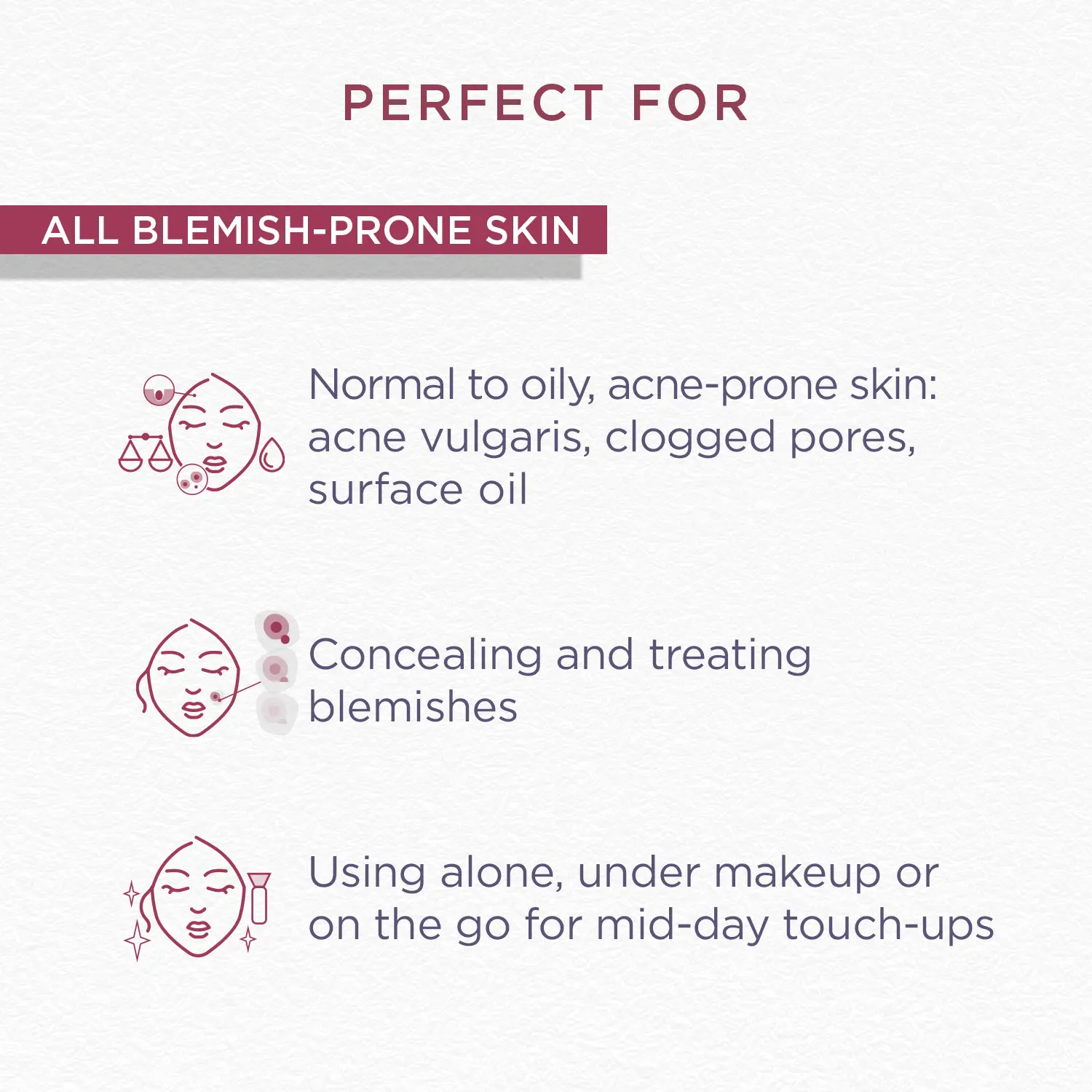 ·Tinted Acne Concealer: Conceals existing blemishes while actively treating them for a flawless complexion.