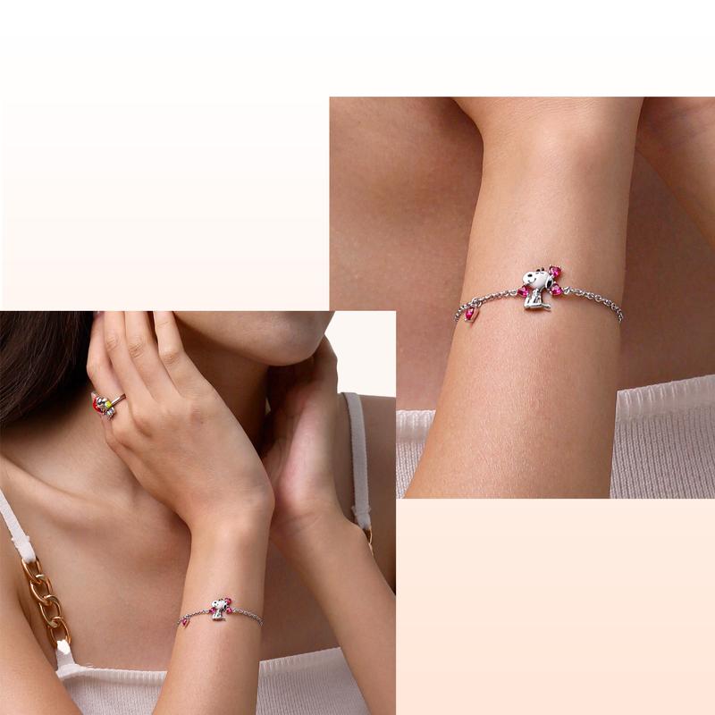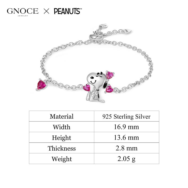 This enchanting bracelet features Snoopy surrounded by sparkling pink heart-shaped zirconia, adding a playful touch to your accessory collection. Easily adjustable with a sliding ball for a perfect fit, it's an ideal gift for Snoopy enthusiasts, celebrating love and whimsy in every wear!