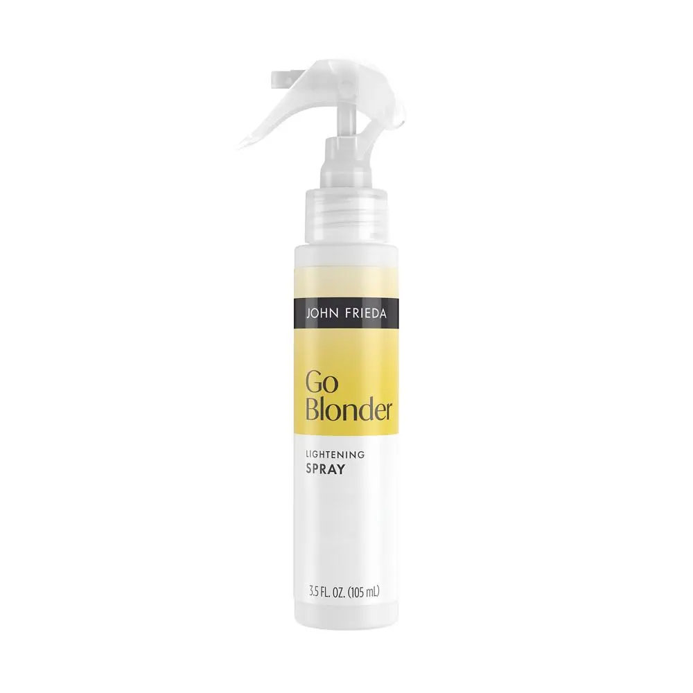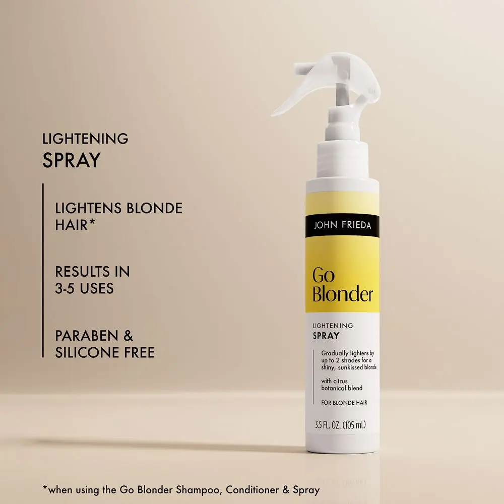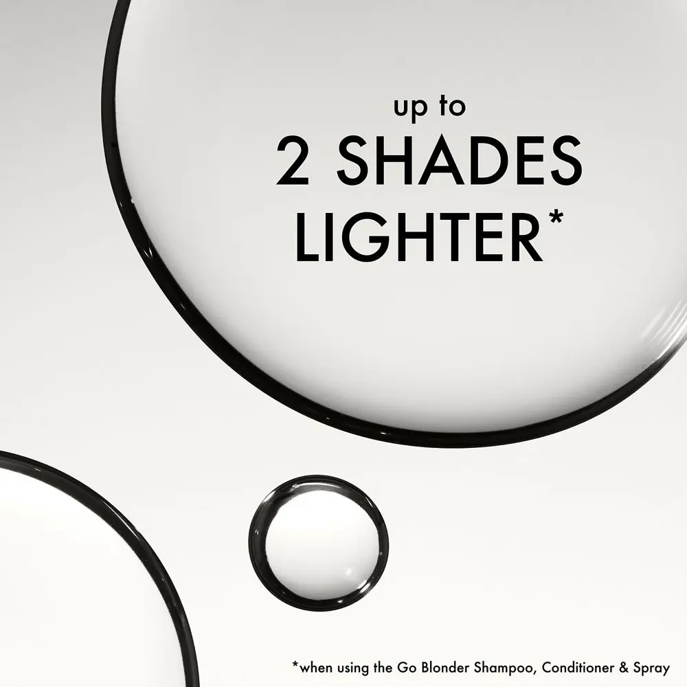 John Frieda Go Blonder Lightening Spray gradually lightens blonde hair up to 2 shades in just 3–5 uses, helping brighten all-over blonde or blend away dark roots for a natural-looking glow.