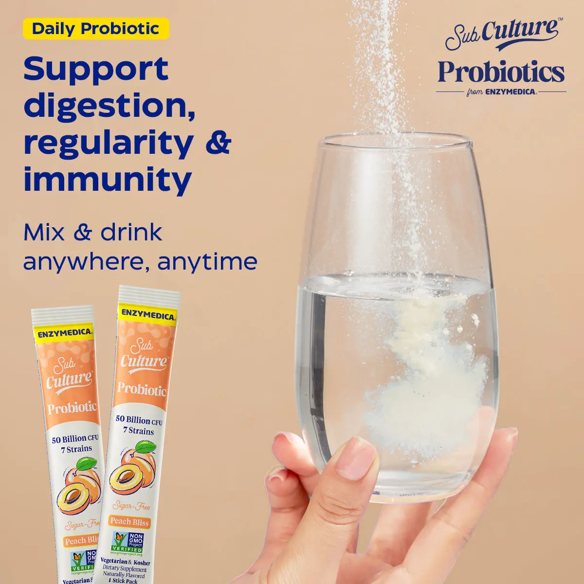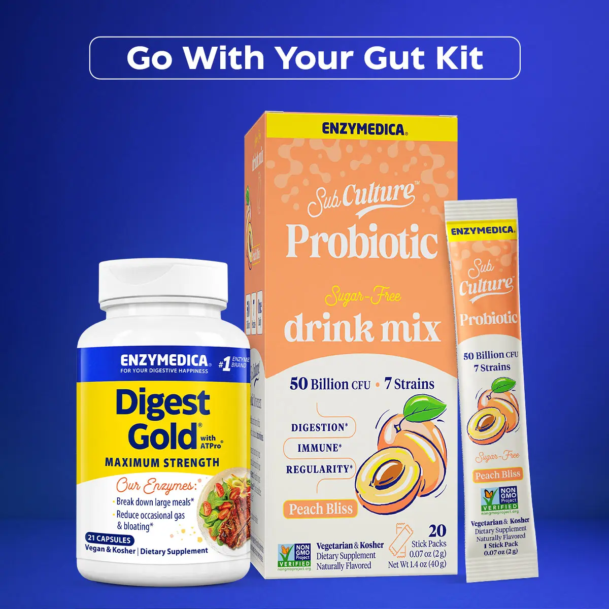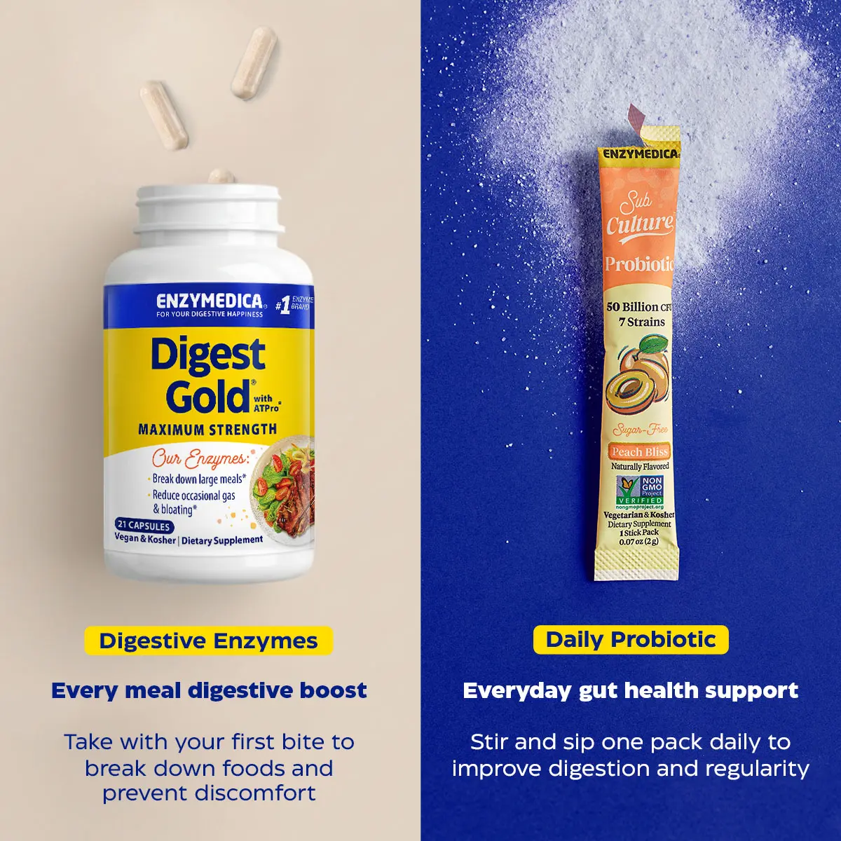 | Ingredients | Digest Gold Digestive Enzymes: Digest Gold Enzyme Blend 430 mg, Carbohydrate-Digesting Enzymes: Amylase Thera-blend (23000 DU), Glucoamylase (50 AGU), Maltase (200 DP), Alpha Galactosidase (450 GalU), Invertase (240 SU) Protein-Digesting Enzyme: Protease Thera-blend (80000 HUT) Fiber-Digesting Enzymes: Cellulase Thera-blend (3000 CU), Beta Glucanase (25 BGU), Xylanase (550 XU), Pectinase (w/ Phytase) (45 Endo-PGU), Hemicellulase (30 HCU) Fat-Digesting Enzyme: Lipase Thera-blend (4000 FIP) Lactose-Digesting Enzyme: Lactase (900 ALU), ATPro 25 mg-300 Million LCU (ATP, Magnesium Citrate, Phytase, CoQ10), 100% vegetarian capsule (HPMC, water),SubCulture Probiotics Stick Packs - Peach Bliss: Total Carb. 1 g (<1%) Xylitol 1 g, Sodium 12 mg (<1%), Probiotic Peach Bliss Drink Mix (50 Billion CFU) (Lactobacillus plantarum, Lactobacillus paracasei, Lactobacillus acidophilus, Lactobacillus casei, Bifidobacterium bifidum, Lactobacillus rhamnosus, Lactobacillus fermentum) 257 mg, Inulin, natural peach flavor, citric acid, malic acid, stevia leaf extract, rice maltodextrin, salt, organic rice hull |