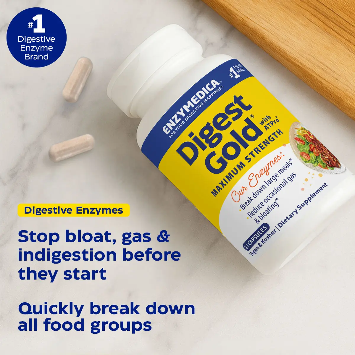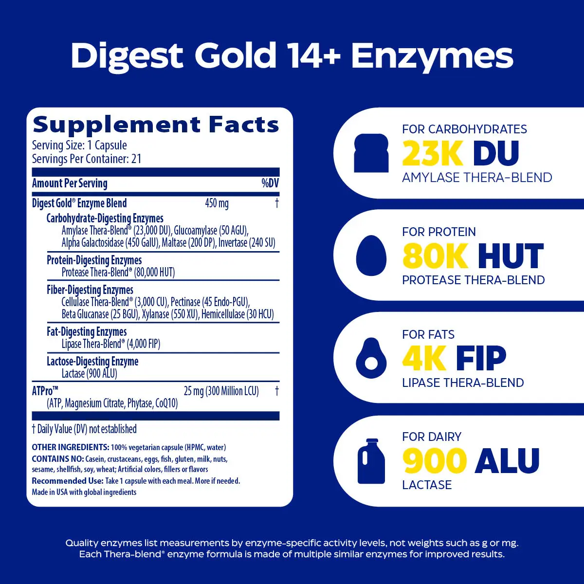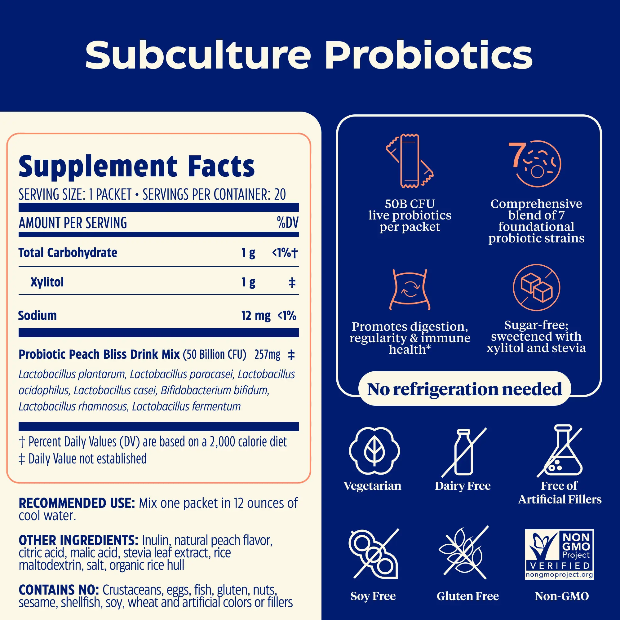 | Ingredients | Digest Gold Digestive Enzymes: Digest Gold Enzyme Blend 430 mg, Carbohydrate-Digesting Enzymes: Amylase Thera-blend (23000 DU), Glucoamylase (50 AGU), Maltase (200 DP), Alpha Galactosidase (450 GalU), Invertase (240 SU) Protein-Digesting Enzyme: Protease Thera-blend (80000 HUT) Fiber-Digesting Enzymes: Cellulase Thera-blend (3000 CU), Beta Glucanase (25 BGU), Xylanase (550 XU), Pectinase (w/ Phytase) (45 Endo-PGU), Hemicellulase (30 HCU) Fat-Digesting Enzyme: Lipase Thera-blend (4000 FIP) Lactose-Digesting Enzyme: Lactase (900 ALU), ATPro 25 mg-300 Million LCU (ATP, Magnesium Citrate, Phytase, CoQ10), 100% vegetarian capsule (HPMC, water),SubCulture Probiotics Stick Packs - Peach Bliss: Total Carb. 1 g (<1%) Xylitol 1 g, Sodium 12 mg (<1%), Probiotic Peach Bliss Drink Mix (50 Billion CFU) (Lactobacillus plantarum, Lactobacillus paracasei, Lactobacillus acidophilus, Lactobacillus casei, Bifidobacterium bifidum, Lactobacillus rhamnosus, Lactobacillus fermentum) 257 mg, Inulin, natural peach flavor, citric acid, malic acid, stevia leaf extract, rice maltodextrin, salt, organic rice hull |
