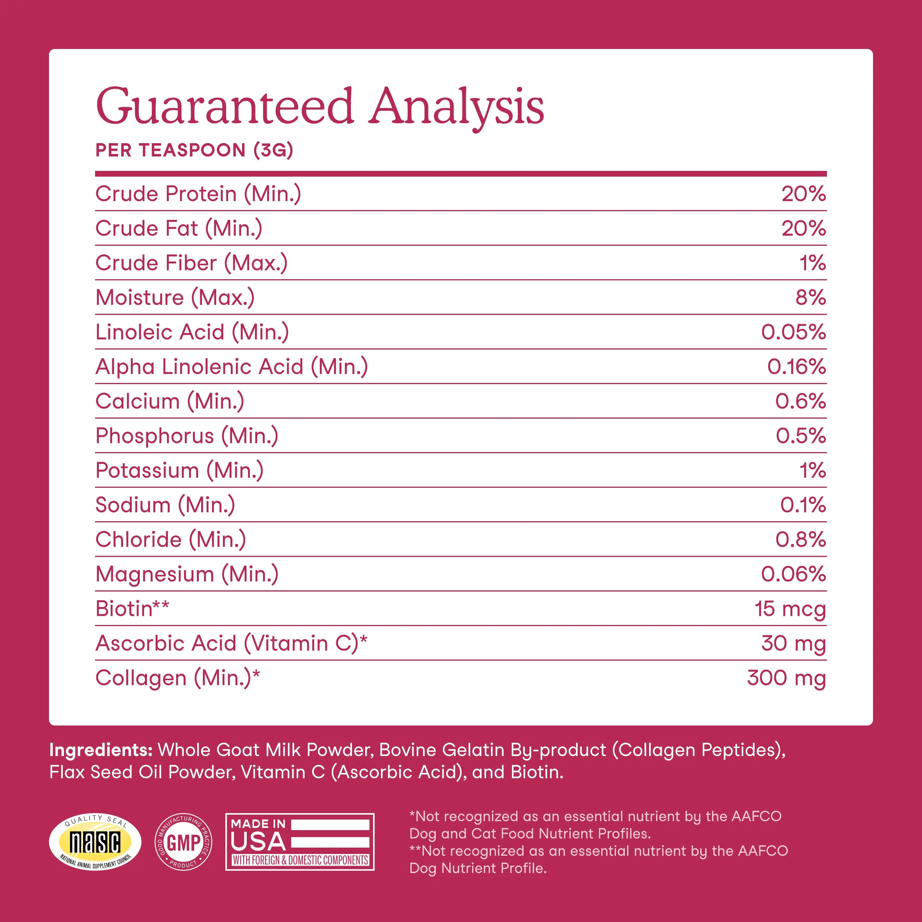 I love that this goat milk powder is enriched with several beneficial nutrients that specifically help with skin and coat health. My dobie mix was rescued a few months ago after being abused and neglected her whole life (a year and a half). She came to me with dry and flaky skin, scars from head to toe, and patchy fur. She is recovering slowly but surely. Now that she has gained some weight back, I wanted to focus more on her skin and fur which has improved a lot but is still dry and flaky. I mix this goat milk in with warm water and put it in her food and she absolutely LOVES it! Licks the bowl clean (which she doesn’t even do with wet food)! I was planning on only feeding this to her until her skin and coat recover but now I’ll have to get it forever since she enjoys the taste so much!