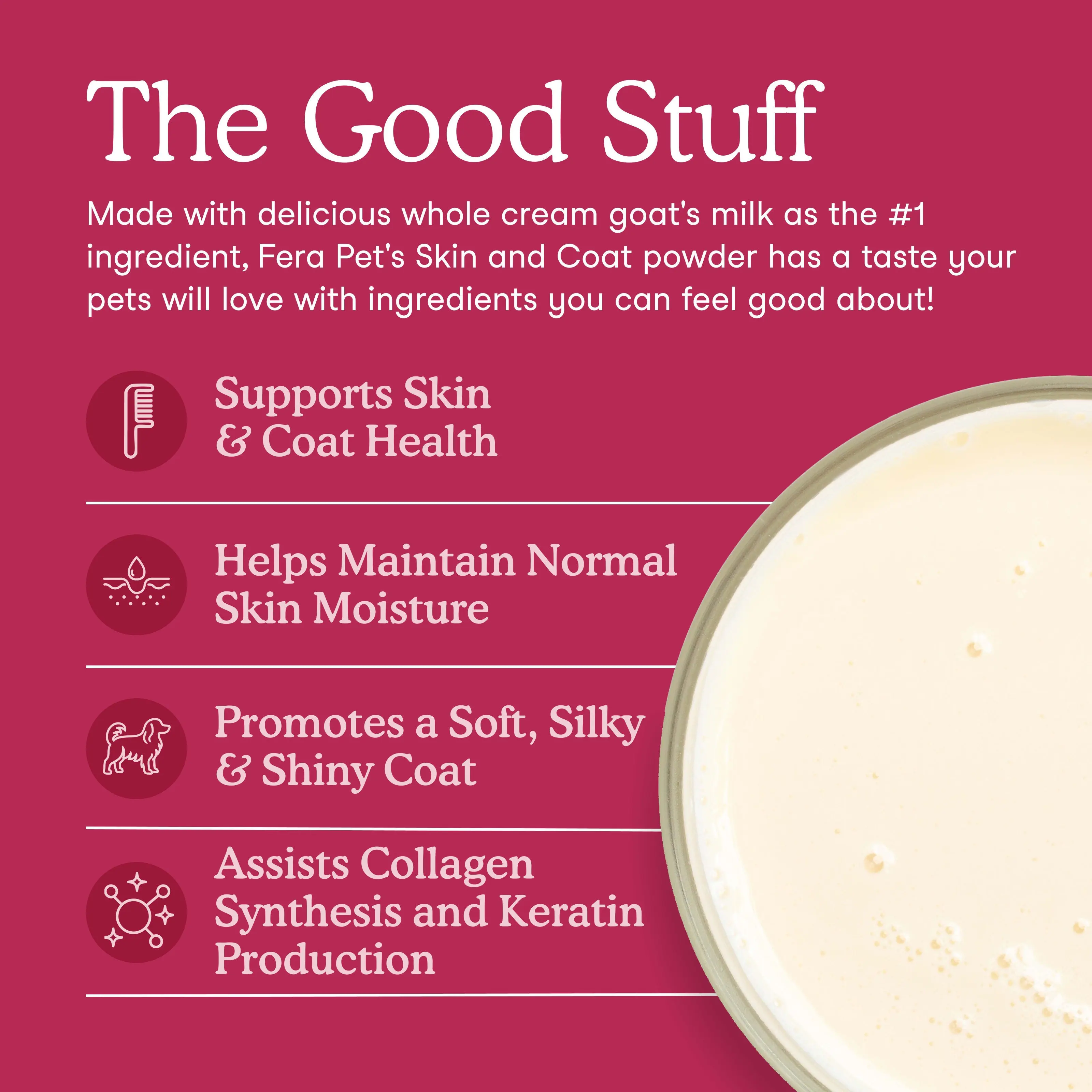 I began using the FERA skin & coat goat milk topper in my cat's breakfast (with wet food). After only a week I noticed a big difference - their coats are so soft & shiny. I use daily, awesome product.