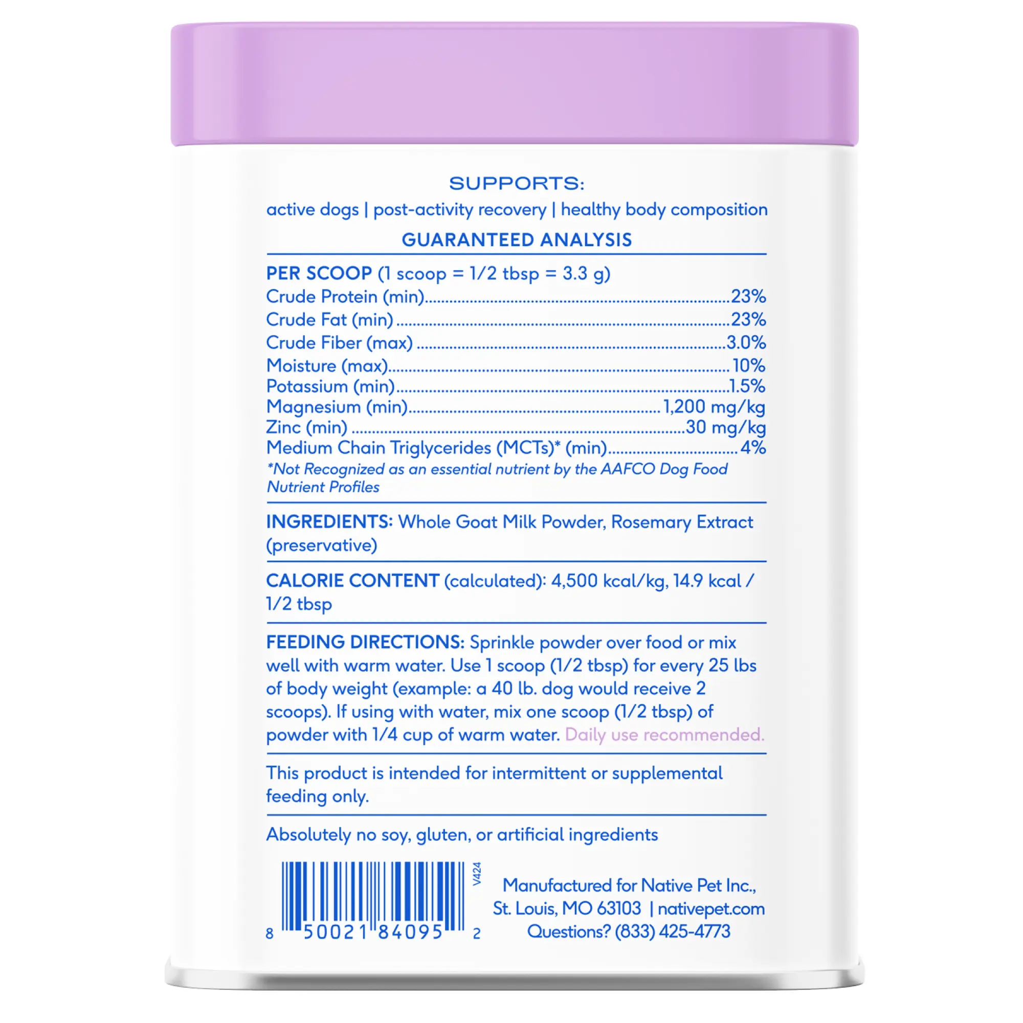 This organic goat milk powder delivers MCTs and minerals for quick, efficient energy. Protein converts easily to fuel, making it ideal for active pups and fast recovery. Protein-packed for muscle recovery and vitality. Easy-to-use food topper to boost hydration. Veterinary-approved for health and immunity support. Ideal for all dog breeds and life stages. Made with wholesome, natural ingredients in the USA.