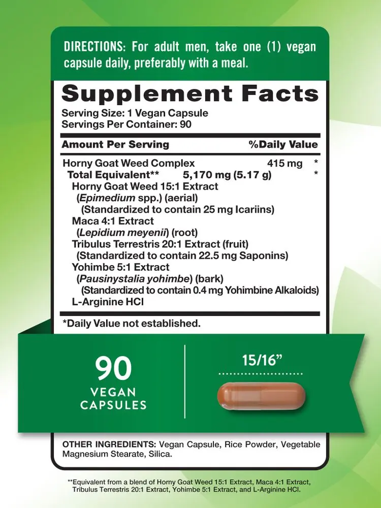 These vegan capsules provide herbal support for men. Each serving delivers 415 mg of a Horny Goat Weed complex, which consists of Horny Goat Weed Extract, Maca Extract, Tribulus Terrestris Extract, Yohimbe Extract, and L-Arginine HCl.