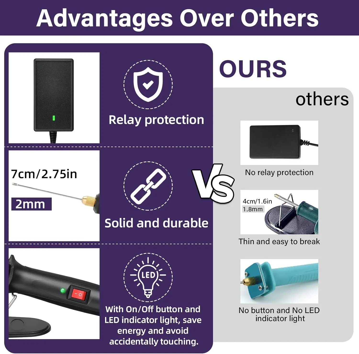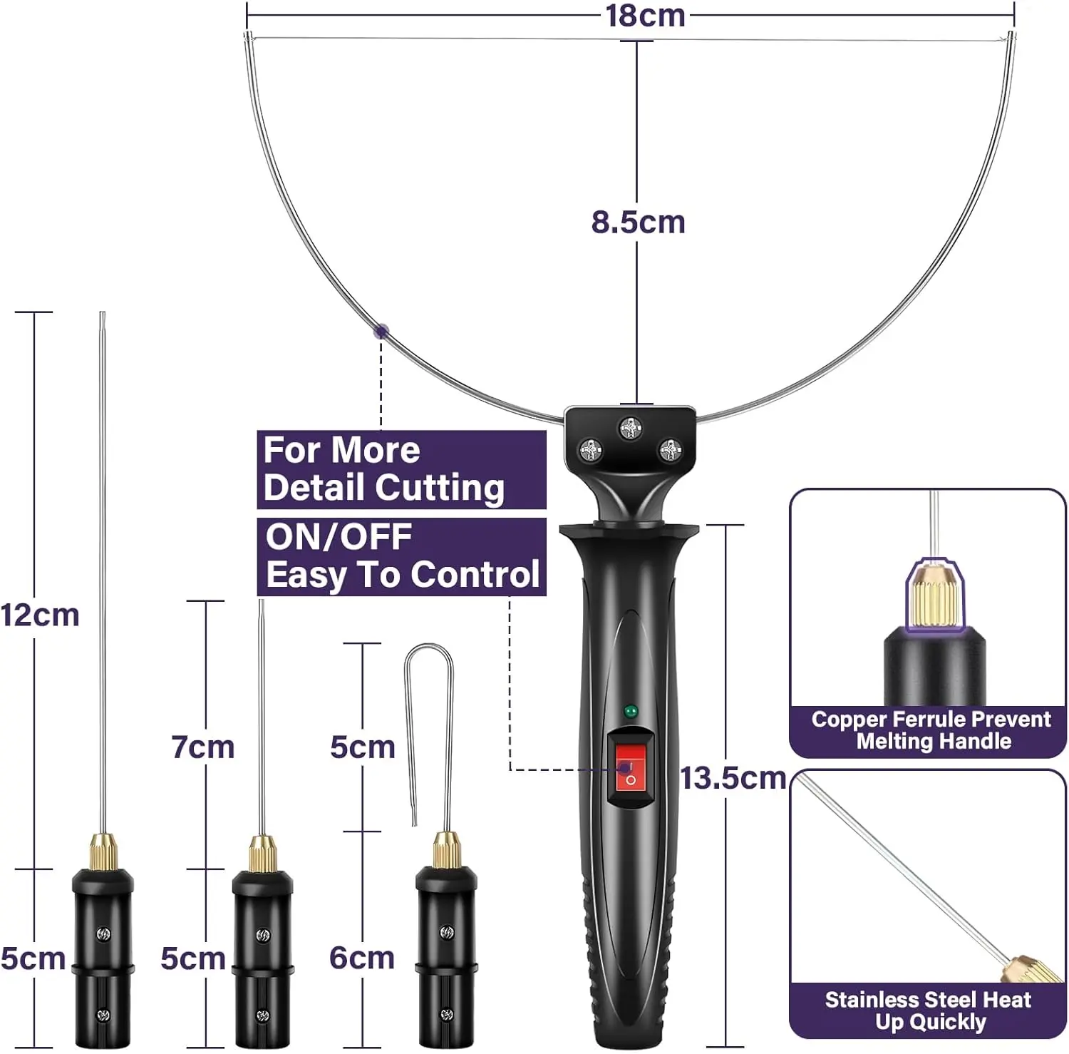 【4 IN 1】This is the perfect set for foam cutting. it's easier and safer for everyone to use it. 7V for the 5cm and 10 cm cutting needle, 9V for the bow cutter. 18w high power with Ul approved power supply and On / Off safety button, 12cm & 7cm wand style hot knife, 5cm bending style hot knife, 18cm bow hot blade, 10m replacement wire for bow, cutter holder.