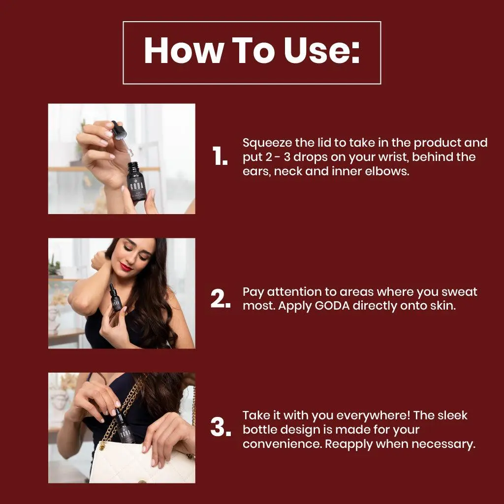 Squeeze the lid and apply 2-3 drops on your wrist, behind the ears, neck, and inner elbows. Focus on areas where you sweat most. Rub gently until the perfume absorbs into the skin. Follow these steps for a long-lasting, captivating scent experience.
