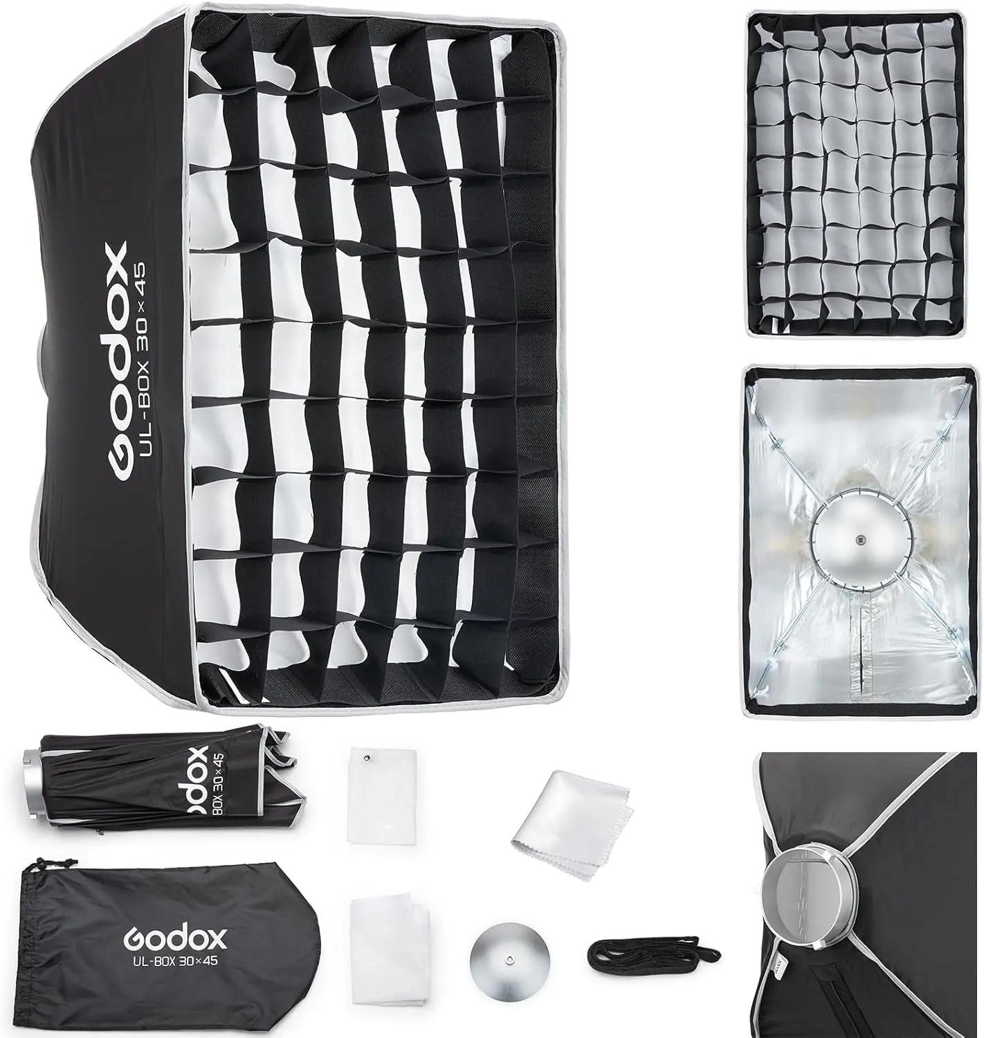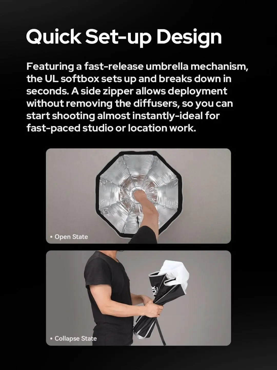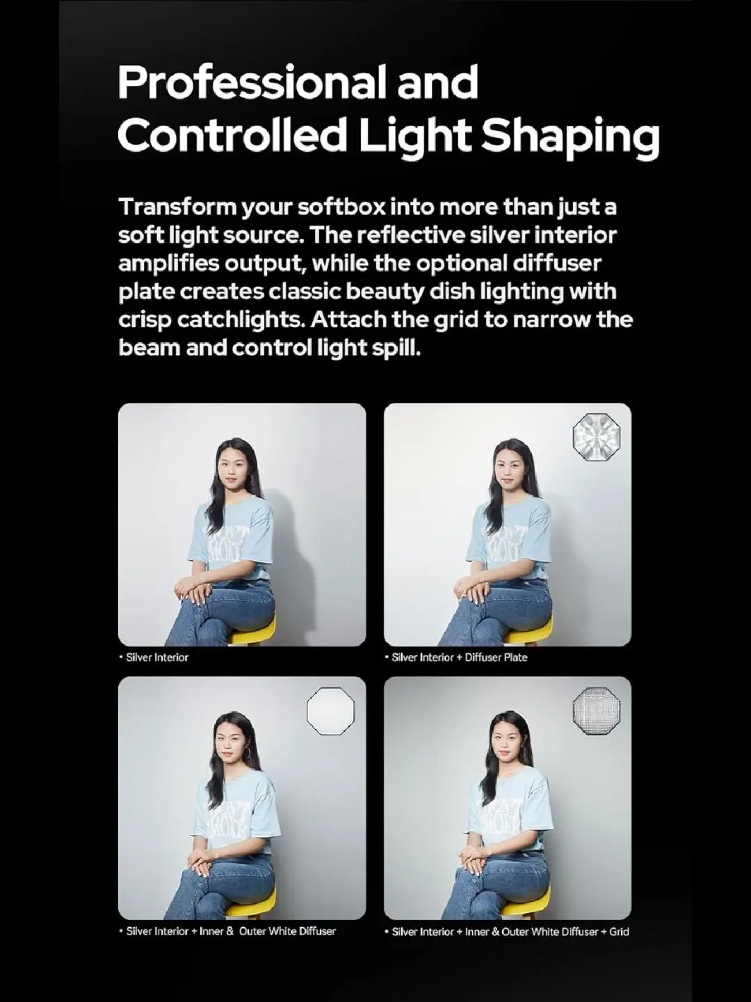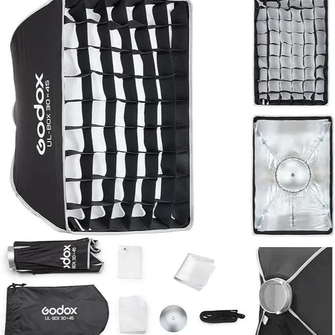 ·Compact, Portable: Built for mobility, each UL softbox is lightweight foldable, and compact-making it the perfect companion foron-the-goshoots, whether you're capturing a wedding, editorial,or location portrait.The reflective silver interior amplifies output, while the optional diffuser plate creates classic beauty dish lighting with crisp catchlights, Attach the grid to narrow the beam and controllight spill.