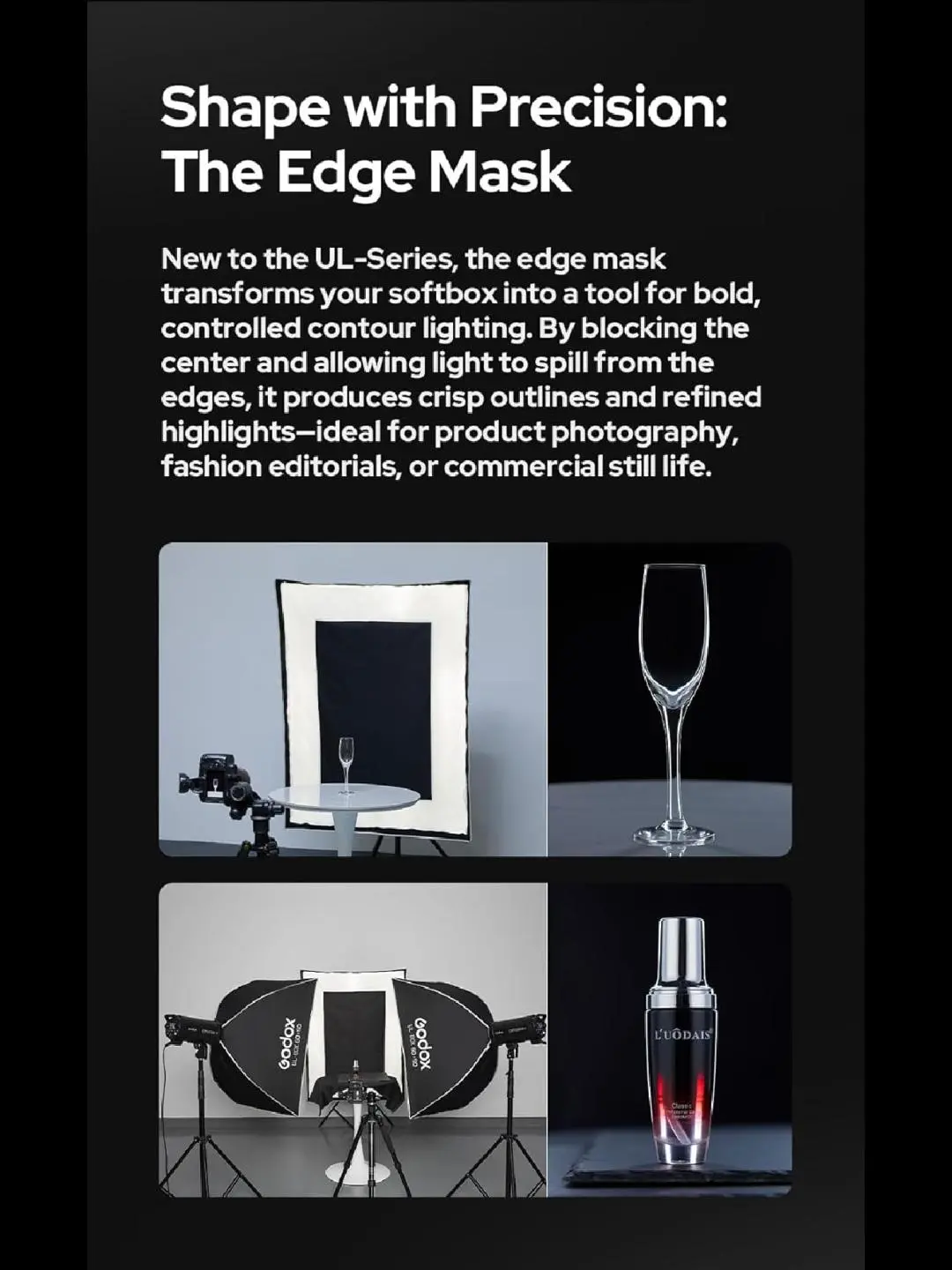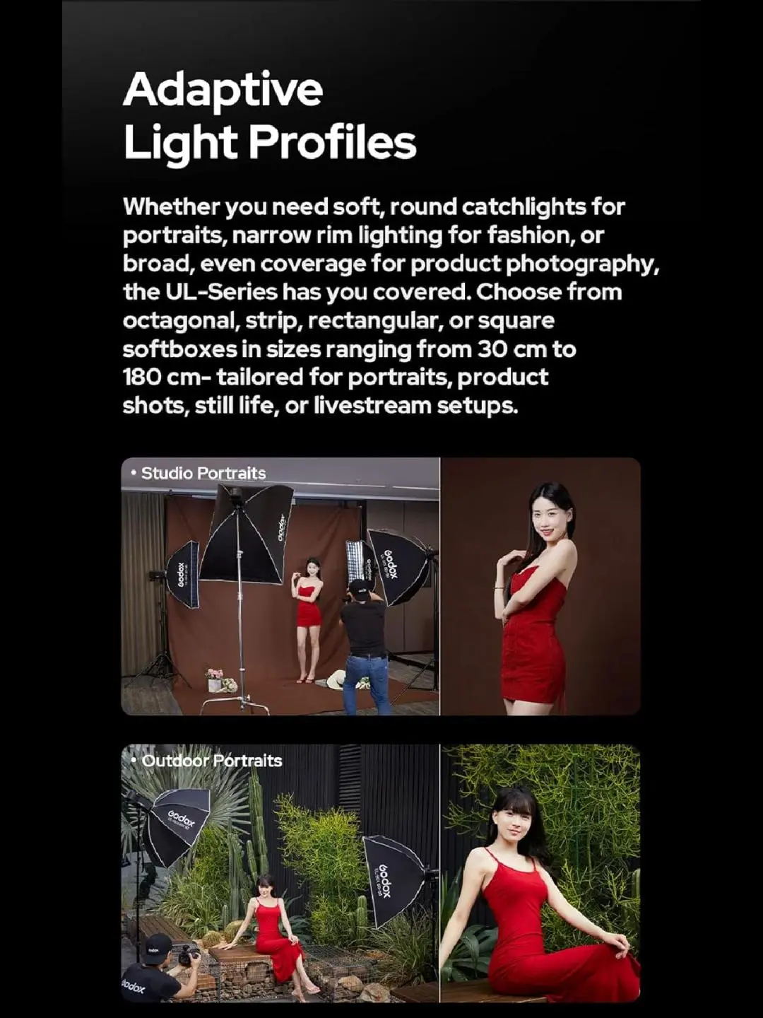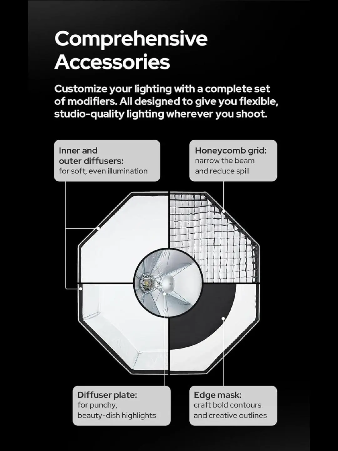 ·Compact, Portable: Built for mobility, each UL softbox is lightweight foldable, and compact-making it the perfect companion foron-the-goshoots, whether you're capturing a wedding, editorial,or location portrait.The reflective silver interior amplifies output, while the optional diffuser plate creates classic beauty dish lighting with crisp catchlights, Attach the grid to narrow the beam and controllight spill.