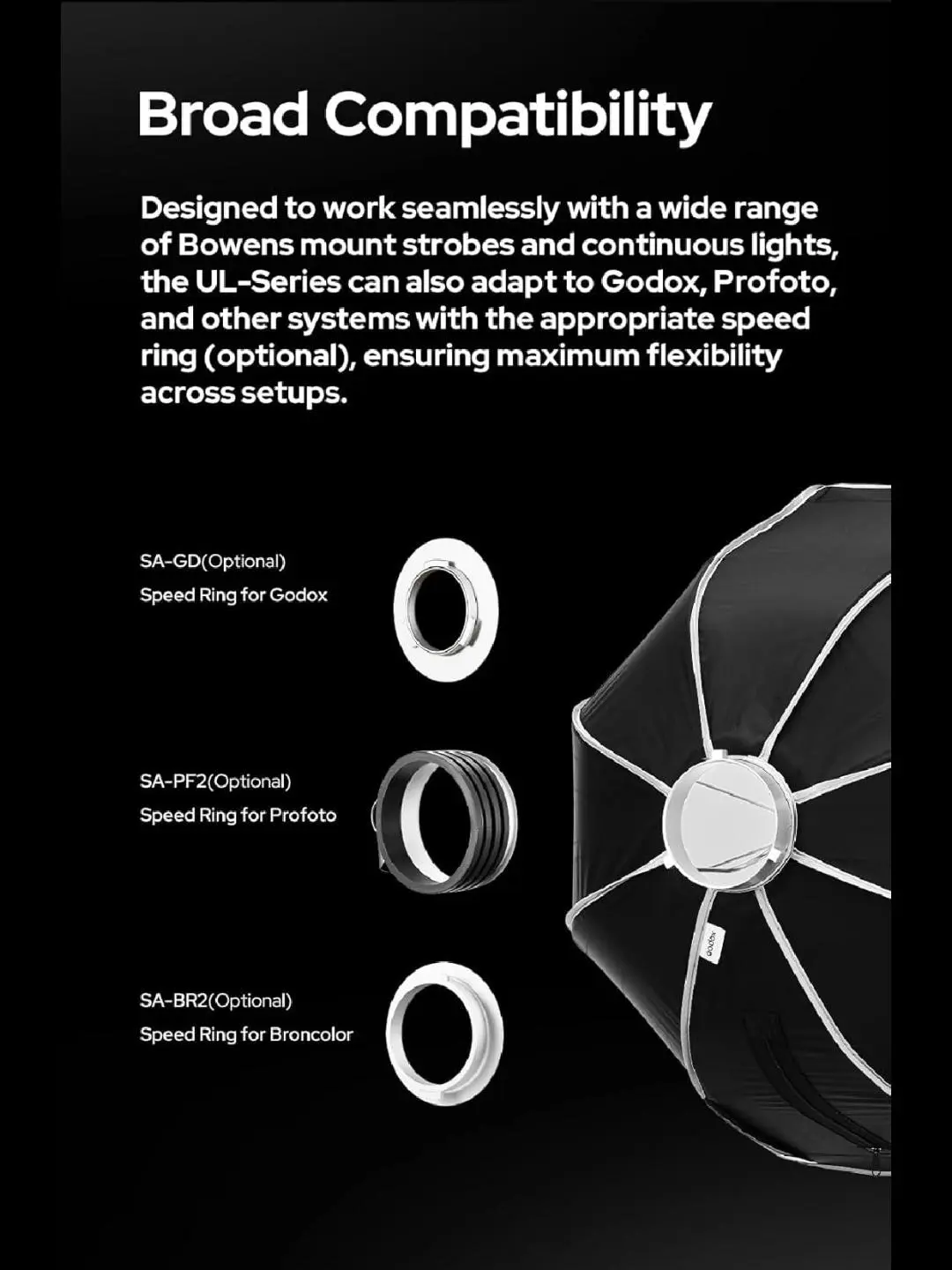 ·Quick Release Godox Umbrella Softbox: The Godox Softbox with Bowens Mount Quick Release Umbrella Softbox is designed with a quick release mechanism for a seamless and hassle-free setup and breakdown, making it an excellent choice for both professional photographers and hobbyists. Take your photography to the next level with the Godox Release Umbrella Softbox.