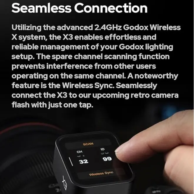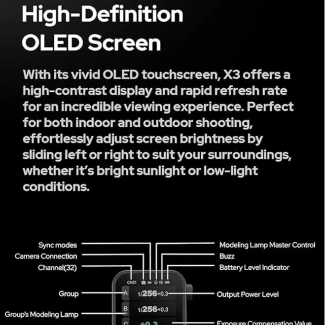 ·High-Definition OLED Screen: Experience unparalleled clarity with the GODOX X3L FLASH TRIGGER's state-of-the-art OLED touchscreen. Engineered for an immersive viewing experience, its high-contrast display ensures vibrant visuals and swift refresh rates.