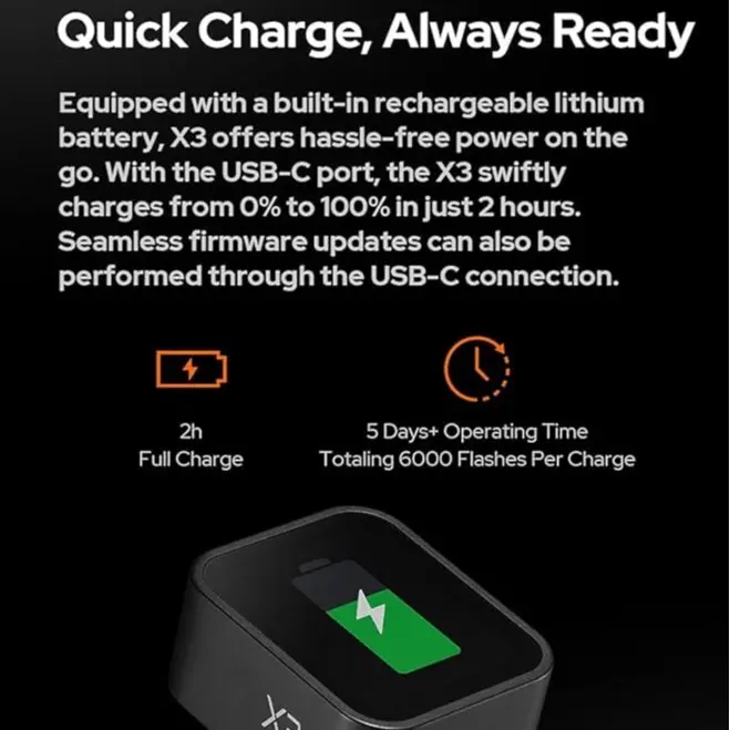 ·Quick Charge, Always Ready: Never miss a shot with the GODOX X3L FLASH TRIGGER's fast-charging, built-in lithium battery. Charge efficiently via the USB-C port, rocketing from 0% to full charge in just two hours.