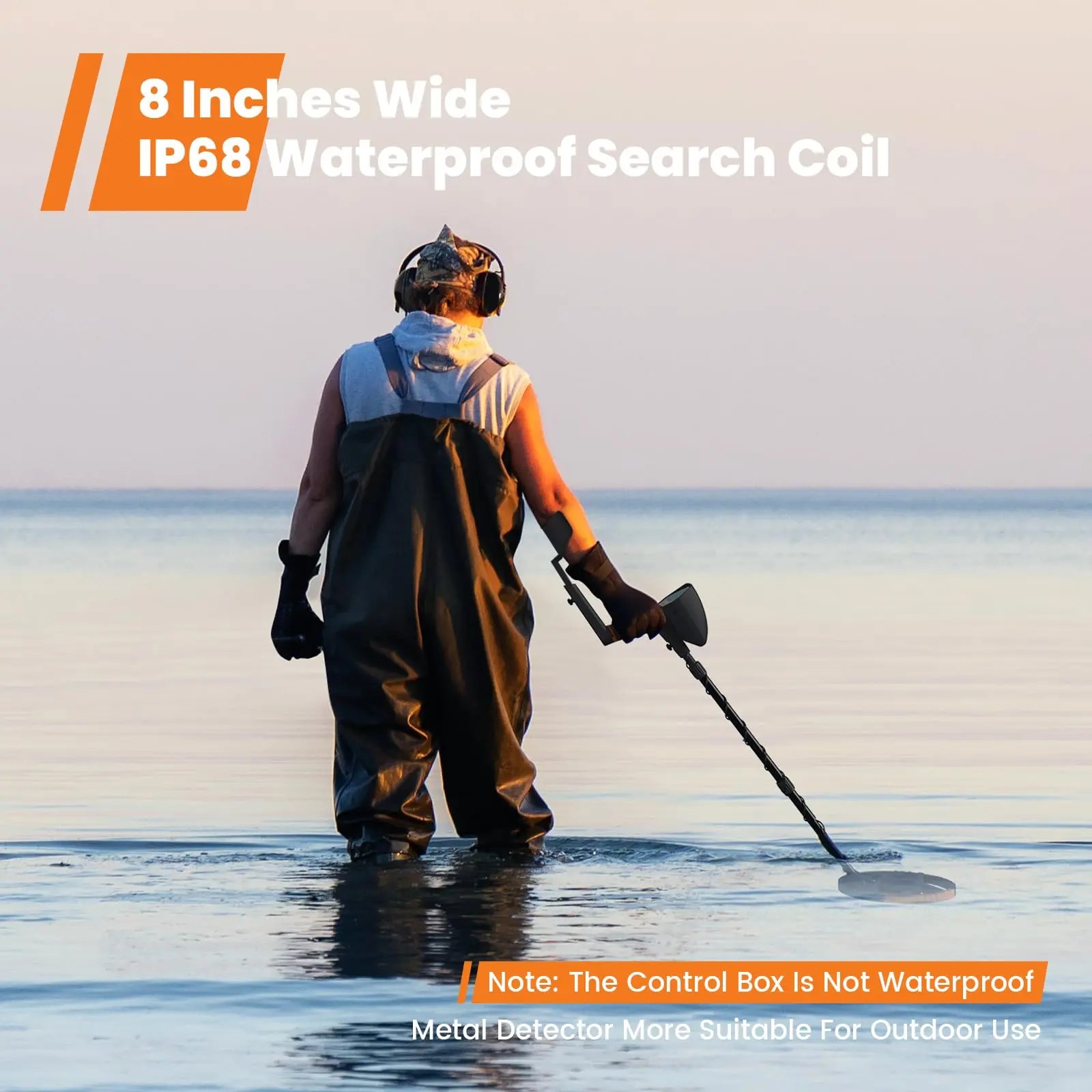 The 8" coil and advanced chip can detect metals up to 8" deep. Its IP68 waterproof rating lets you use it underwater—ideal for beaches, creeks, and outdoor adventures (note: control box is not waterproof).