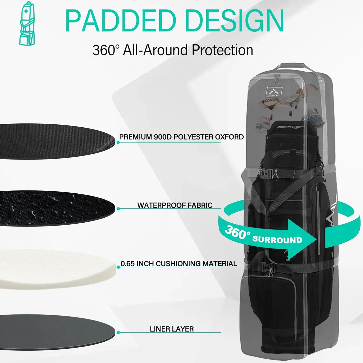 【Unique Design】: The travel golf bag has a thick padded top and two stabilizing straps outside to protect your golf clubs. The front pocket is designed for golf shoes, towels, and other golf accessories