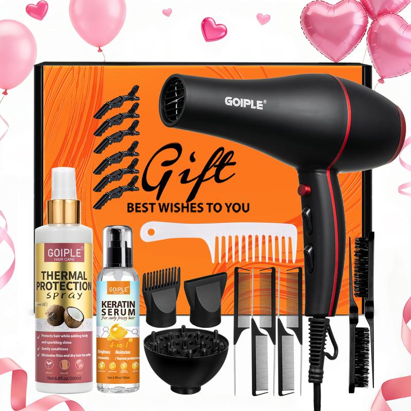 ·【21 Counts Comprehensive hair dryer Kit】This kit including a high-quality hairdryer along with an array of blow dryer comb attachment. You'll receive 1 count hair blow dryer+1 count 6.8fl.oz thermal protection+1 count 3.4oz keratin serum+1 count 9 row styling nylon detangler brush+1 count comb nozzle+1 count concentrator+1 count full size diffuser+2 counts bristle brush+5 counts parting brush+1 count wide tooth comb+6 counts hair clips.