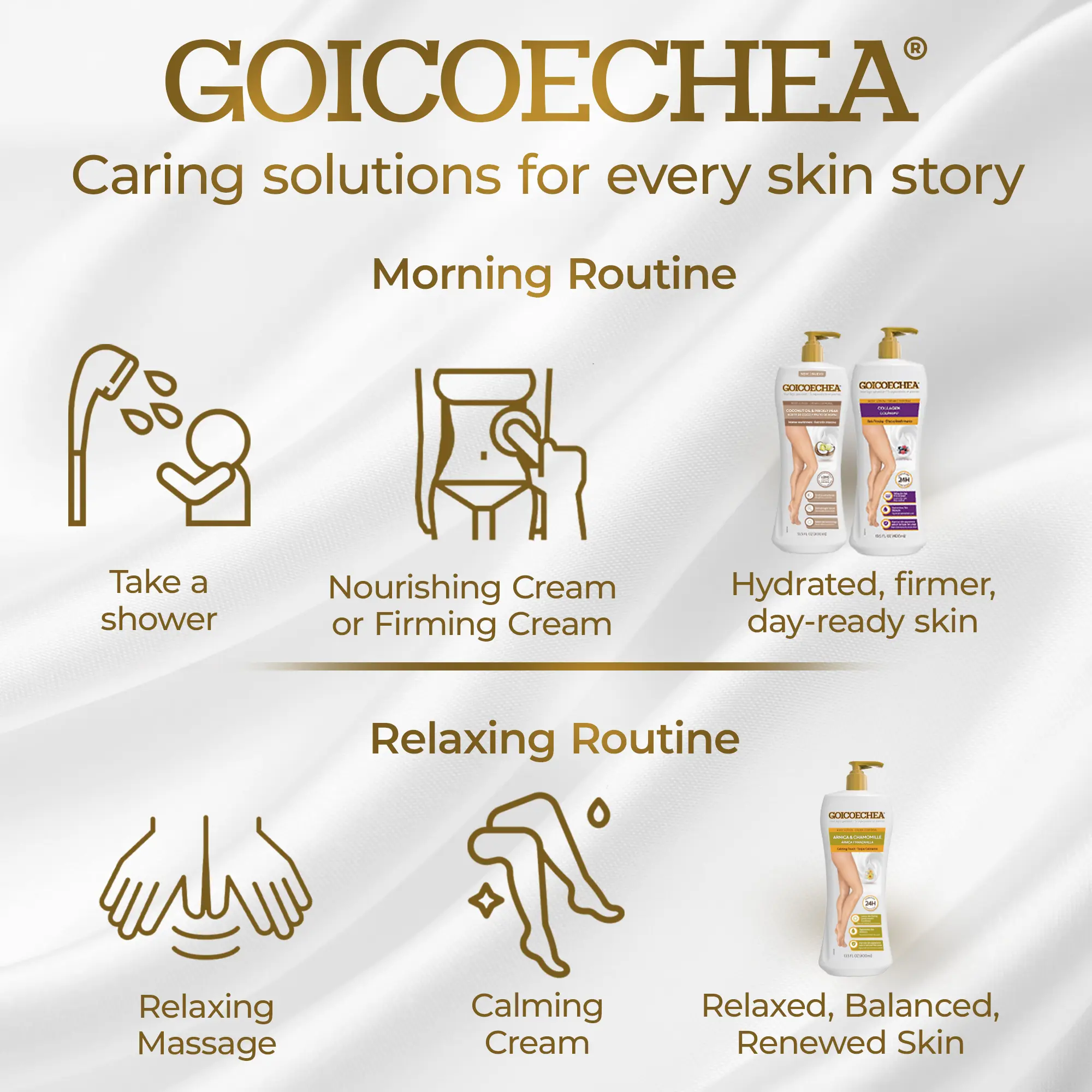 The Goicoechea Variety Pack includes three lotions—Calming Touch, Skin Firming, and Coconut—formulated to provide daily moisturization and support comfortable-feeling skin. Each lotion offers a different texture and sensory experience for everyday body care. Apply as directed on clean, dry skin.
