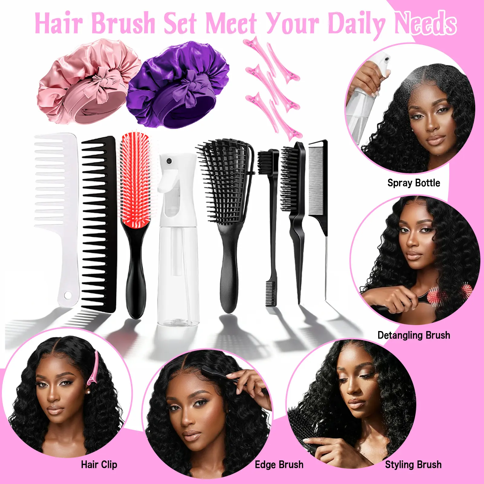 Pink Hair Brush Set 16 Counts Detangler Wide Tooth Comb Satin Bonnet Nylon Bristle Brush Edge Tool Kit for Curly Hair Styling  Anti Static Hairbrush