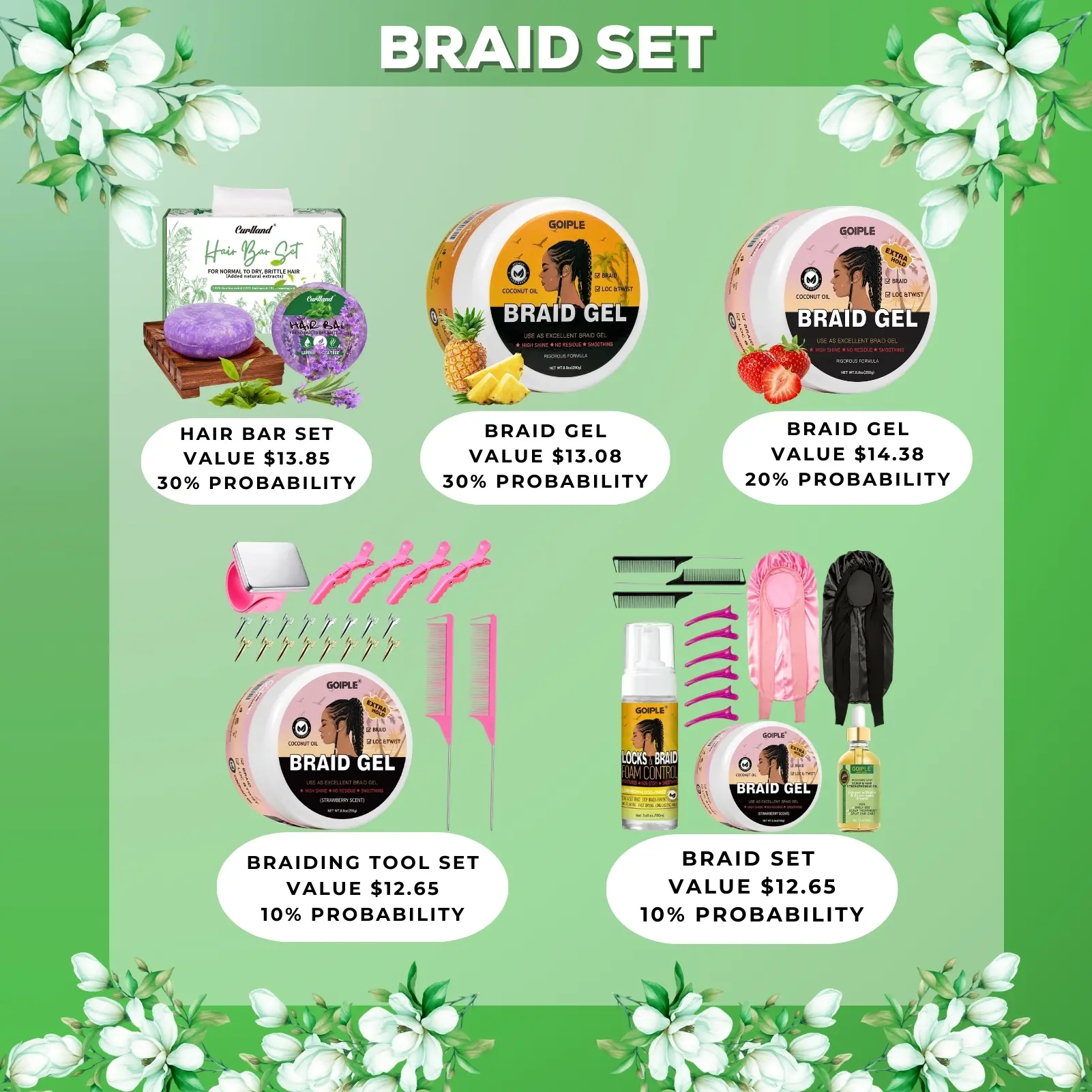·Braid Set: 100ml braid mousse + 500g braid gel + 30ml rosemary oil + 2 braid bonnets + 6 hair clips + 3 parting brushes (10% probability)