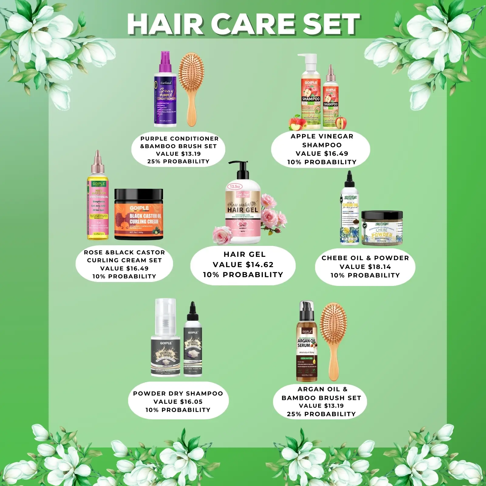 ·Apple Vinegar Shampoo: 300ml apple vinegar shampoo + 120ml hair oil (10% probability)