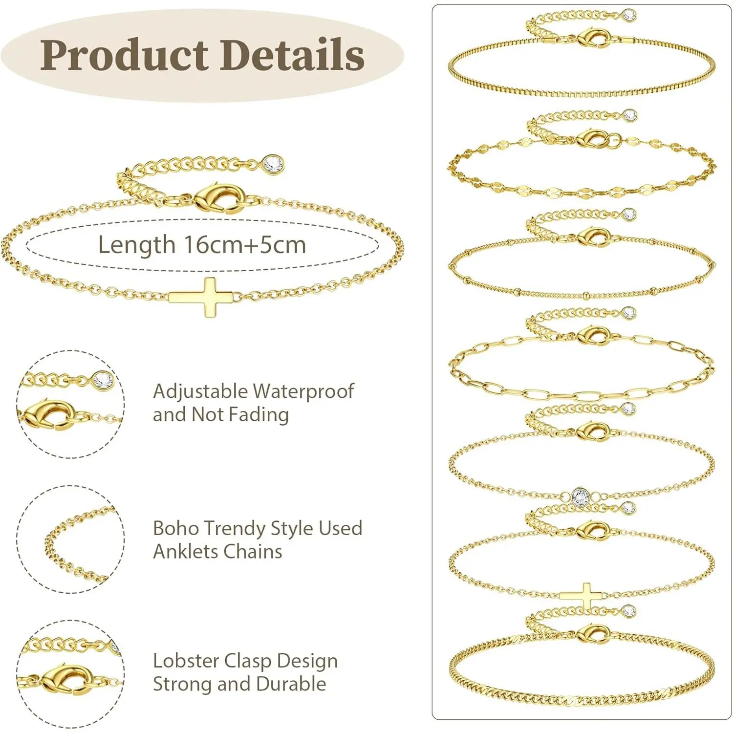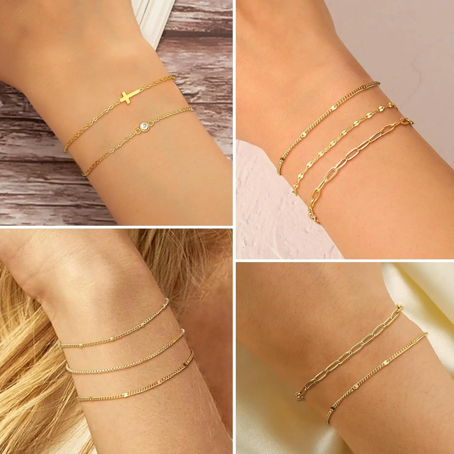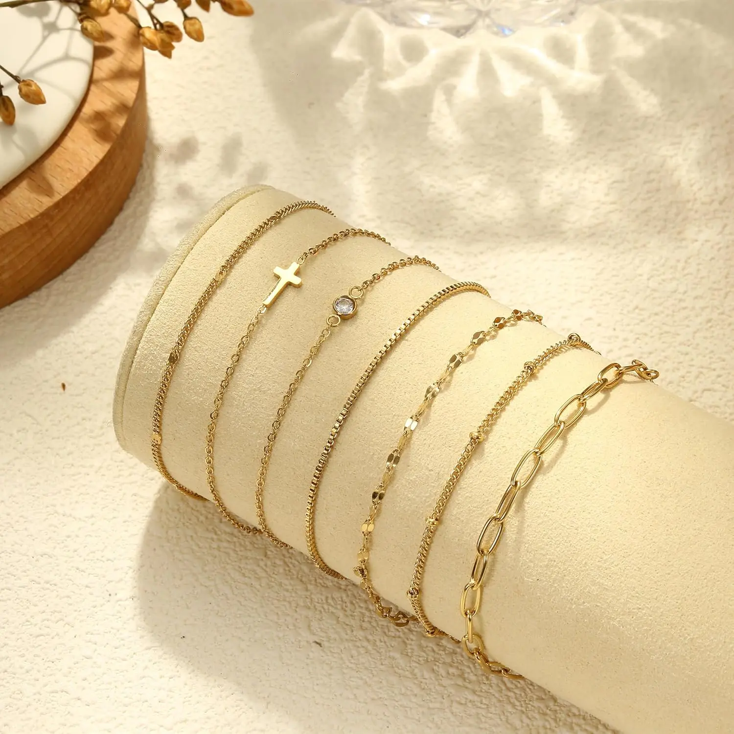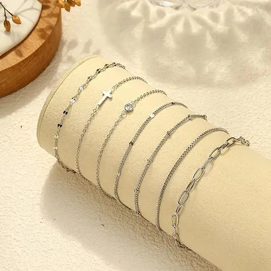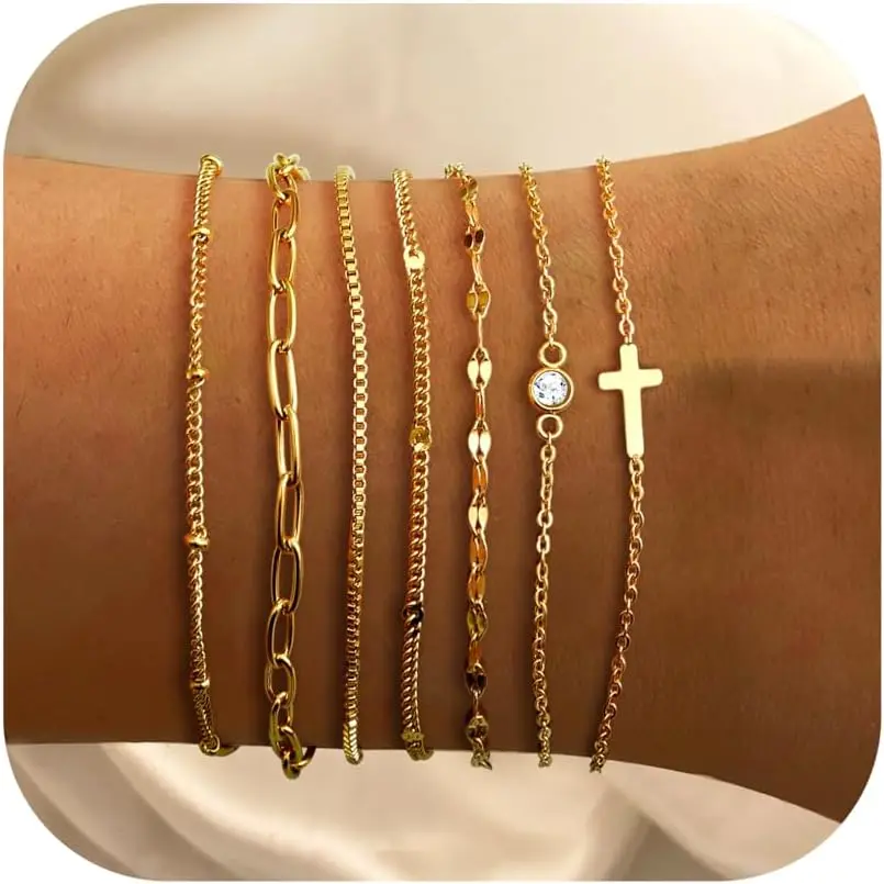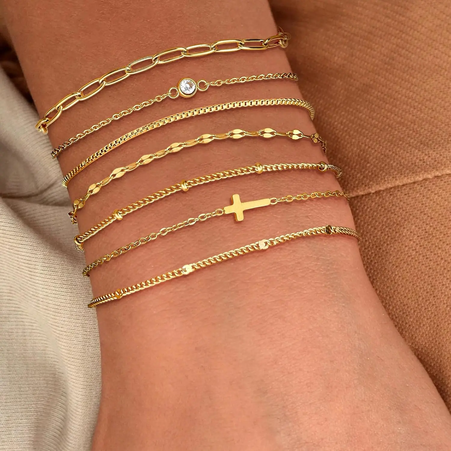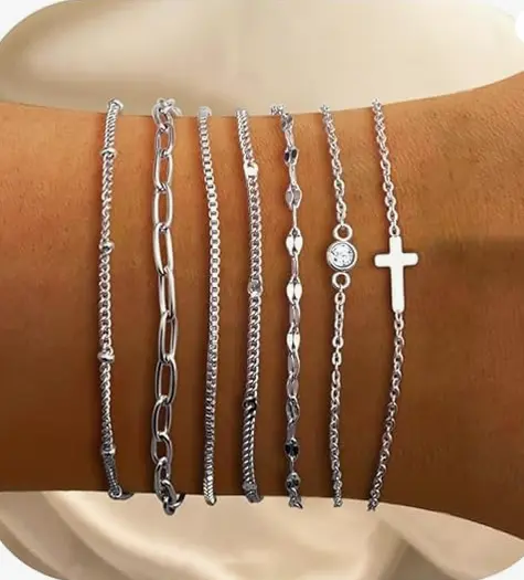 ·Set Contents: 7 stackable chain bracelets, including box link, lip, satellite, paperclip link, cubic zirconia, prettiest cross, and Cuban chain.