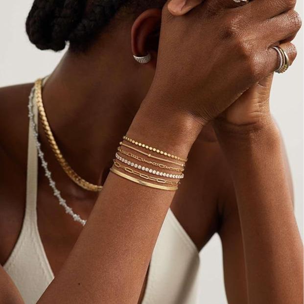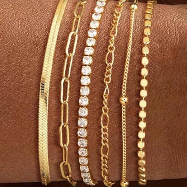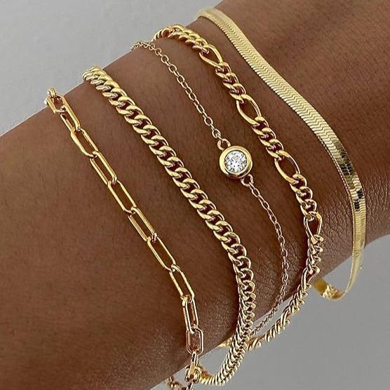 ✨ 6-Piece Gold Bracelets Set: This set includes tennis, figaro, dot chain, paperclip, satellite, and herringbone bracelets. Perfect for layering or solo wear. Each piece is designed for versatility and style.