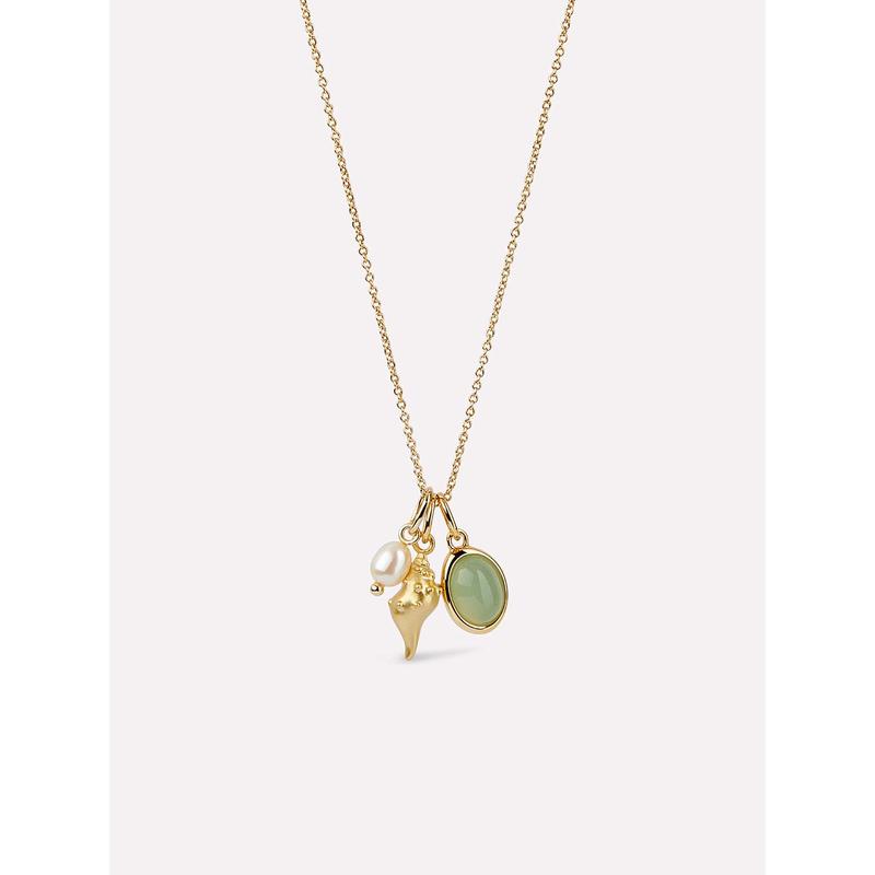 Dive into the beauty of this gold charm necklace designed in collaboration with influencer @OceansASMR. This piece is dipped in 14k gold and features three unique sea-inspired charms: a conch shell, a freshwater pearl, and a glass pendant. To channel your inner mermaid, pair this gold charm necklace with our Frida gold huggie hoop earrings.