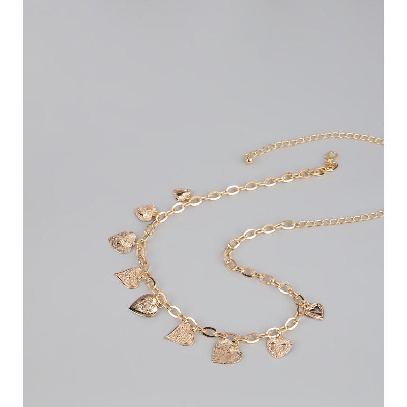Show your waist some love with this golden heart charm chain belt. Featuring a series of textured heart pendants dangling from a sleek chain, it adds playful movement and shine to any outfit.