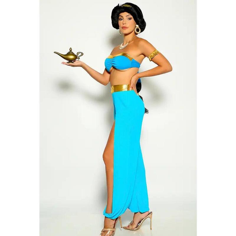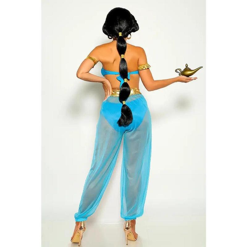 Rock this exotic princess J costume this Halloween for a bold look! Featuring; 4 piece, strapless bandeau gold trim top, slit mesh pants, 2 arm bands, and underwear bottoms. Followed by a fitted wear. Please note; Lamp and accessories are NOT included.