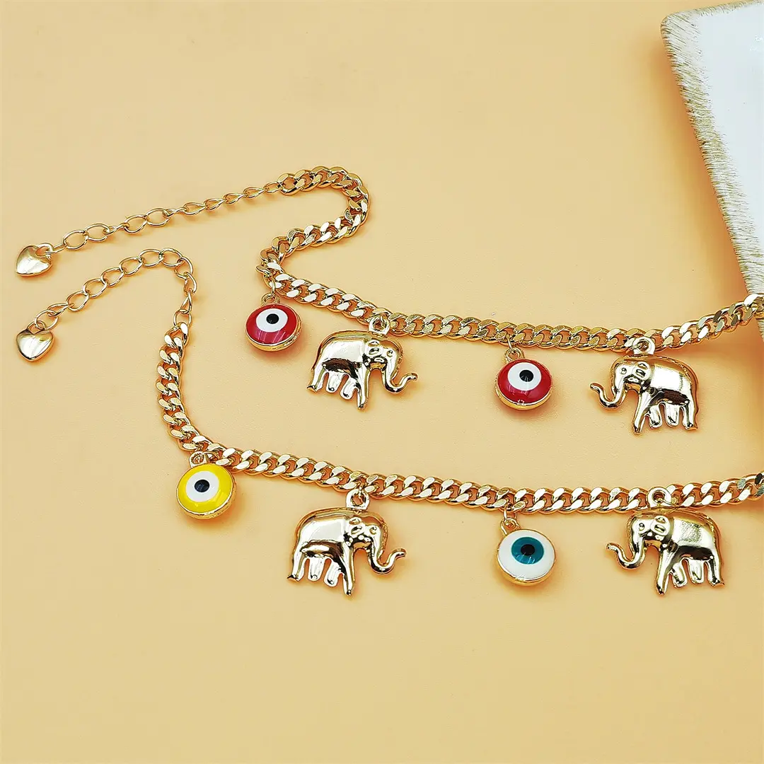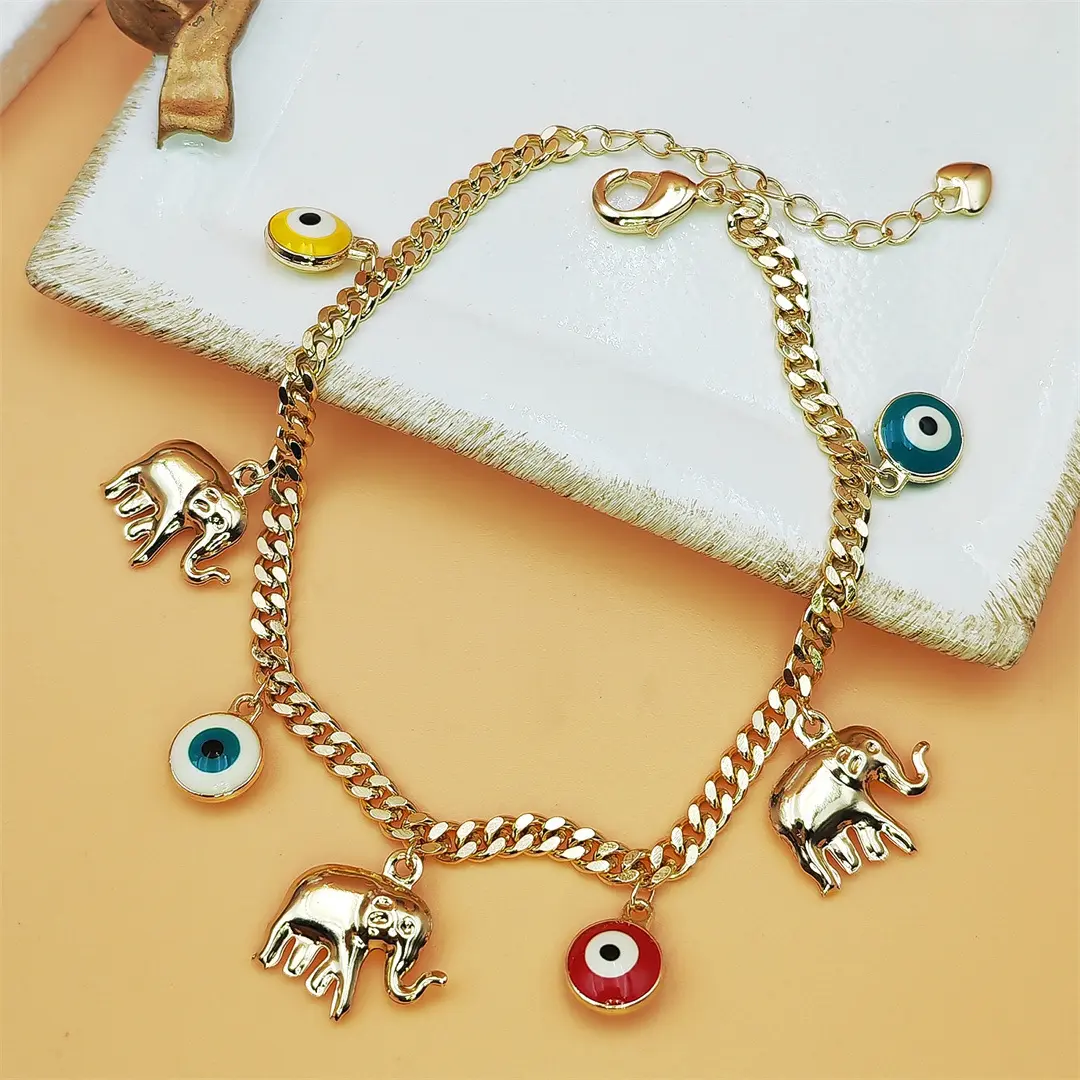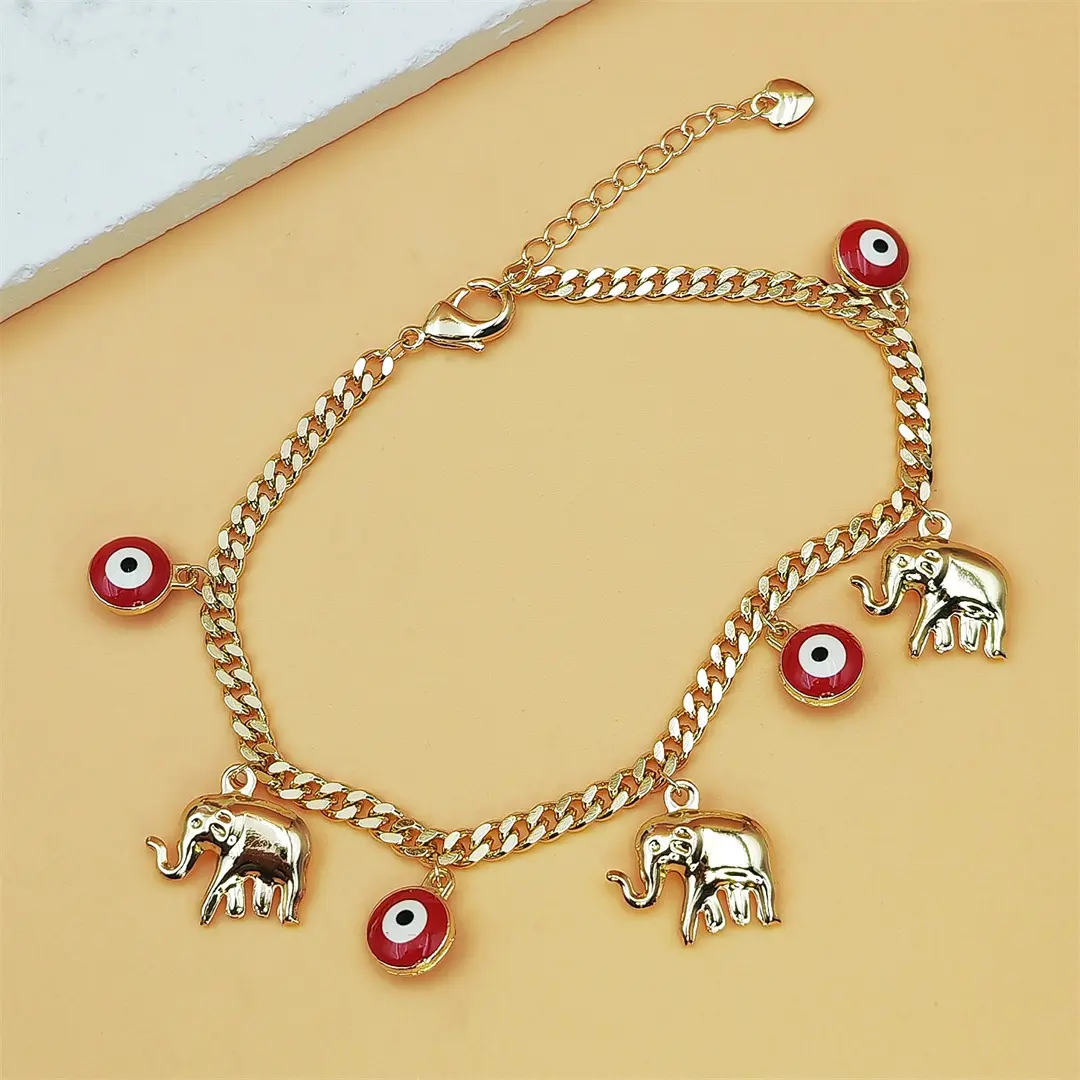 ✨ Stylish Accessory: This bracelet features a gold chain adorned with devil's eye charms and baby elephant pendants. Perfect for adding a touch of elegance to any outfit. 🐘