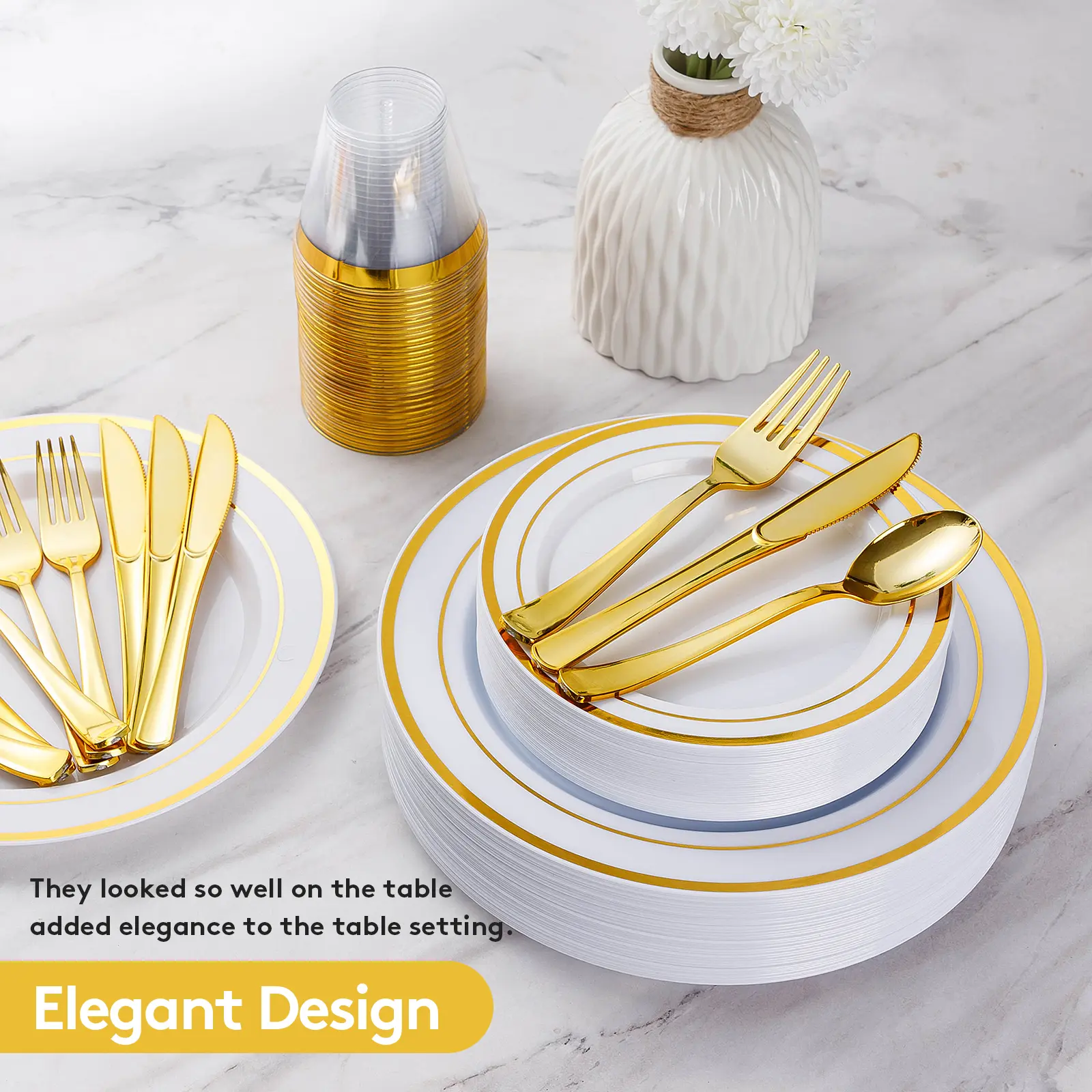 ·The gold rimmed party plates have a premium look, resembling porcelain. Their sophisticated appearance makes them suitable for any event, blending seamlessly with all kinds of decor. 🎨