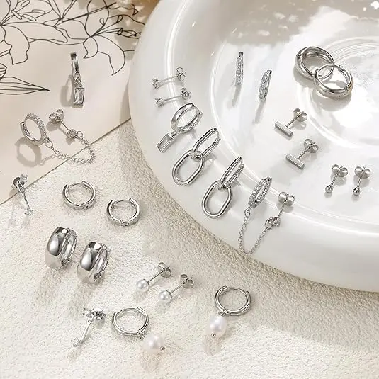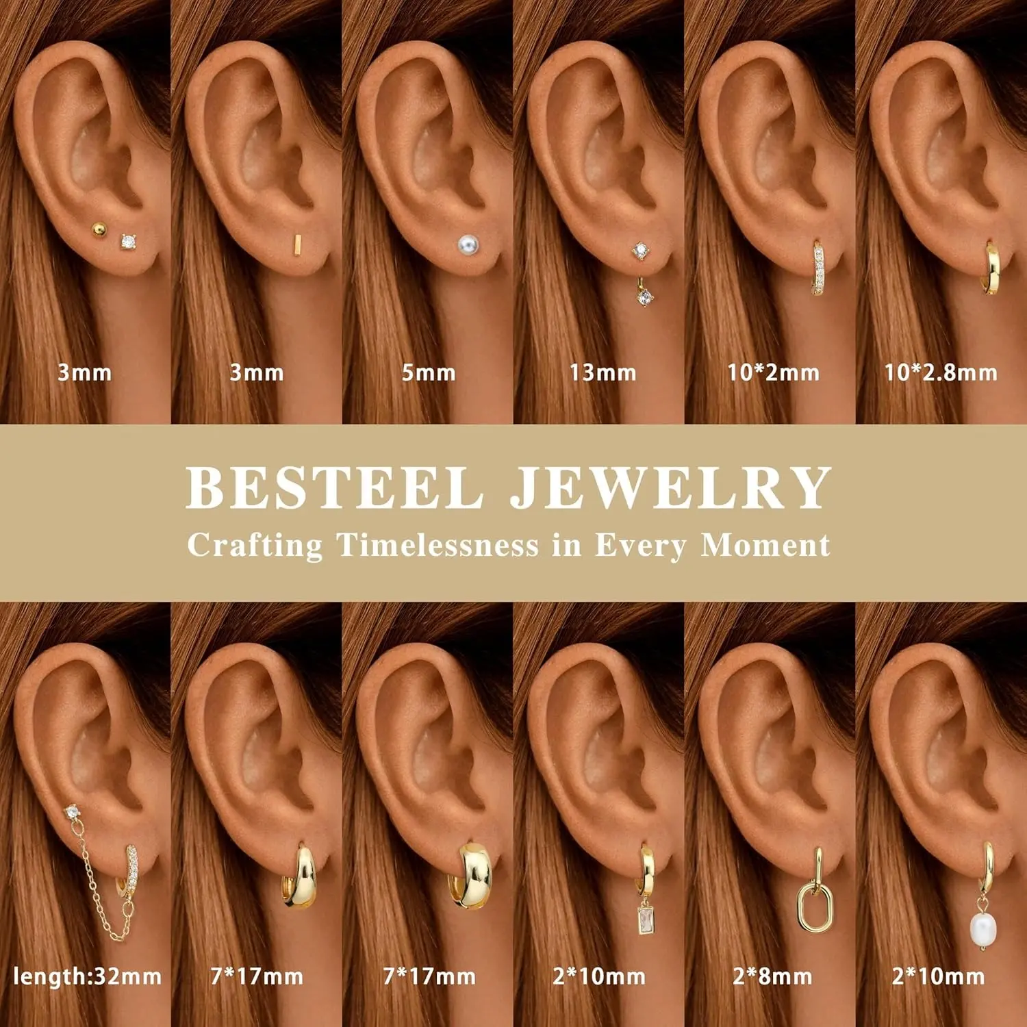 Earrings Set: This set includes 13 pairs of diverse ear studs and hugger earrings, offering a variety of styles such as CZ studs, pearl drop earrings, chunky hoops, and chain earrings. Ideal for various occasions and styling needs.