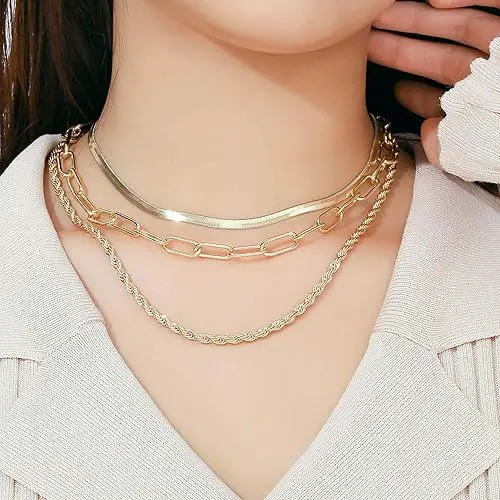 ·LAYERED NECKLACE: 3Pcs Layered necklace, chunky link chain necklace, snake chain necklace, gold rope chain necklace. Fashion originates from classics, minimalism design, great for wearing alone or layering with other dainty necklaces.
