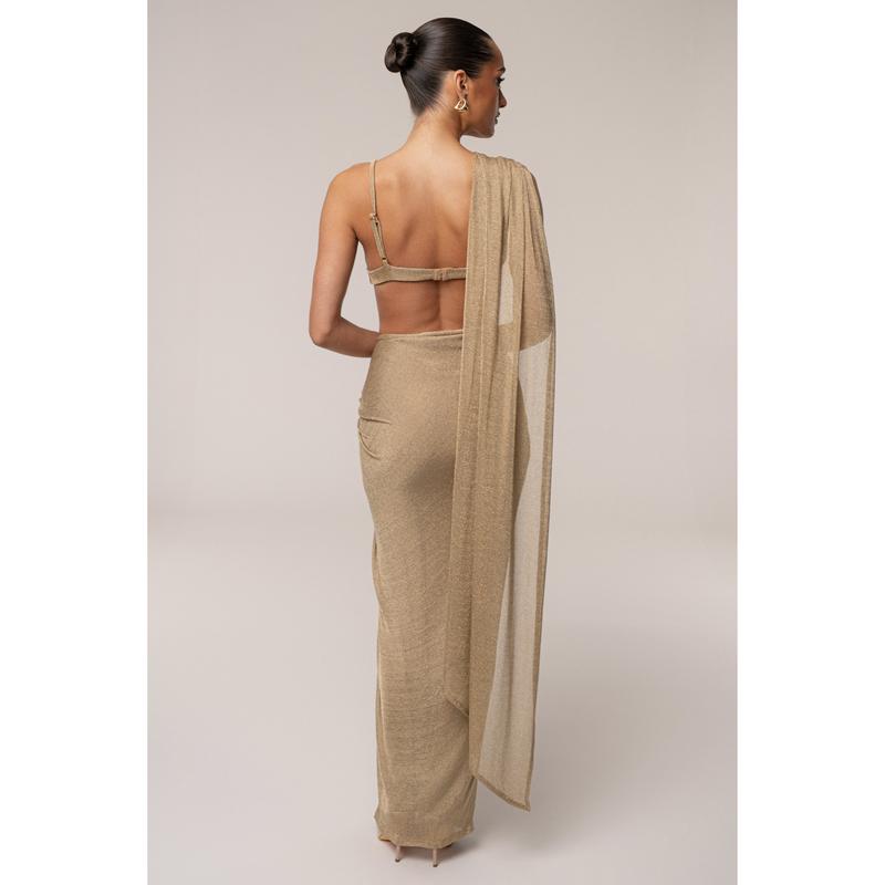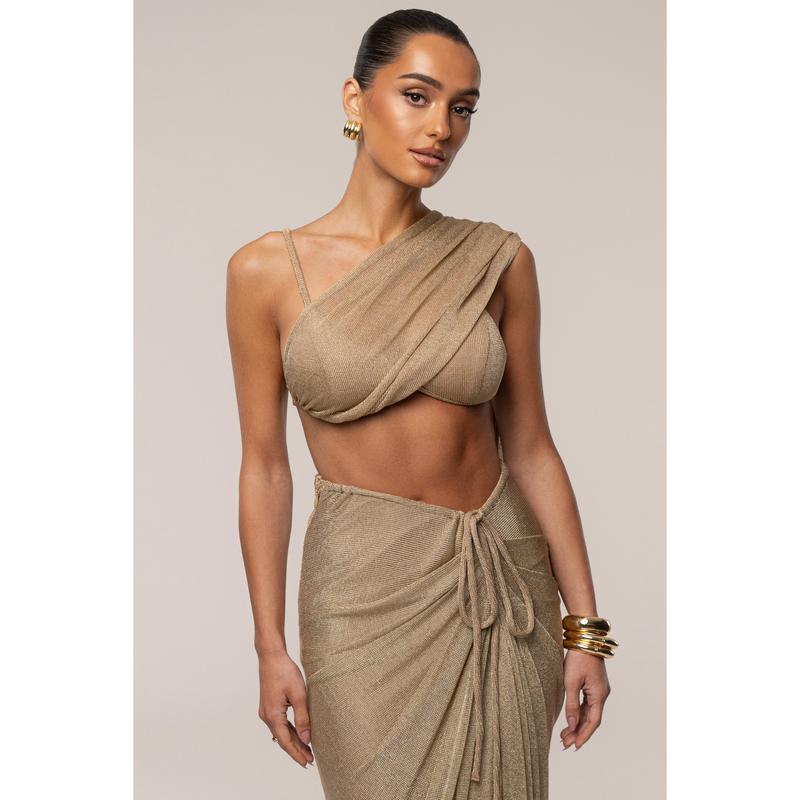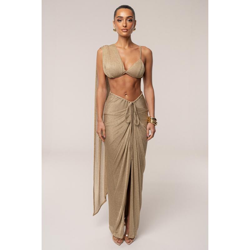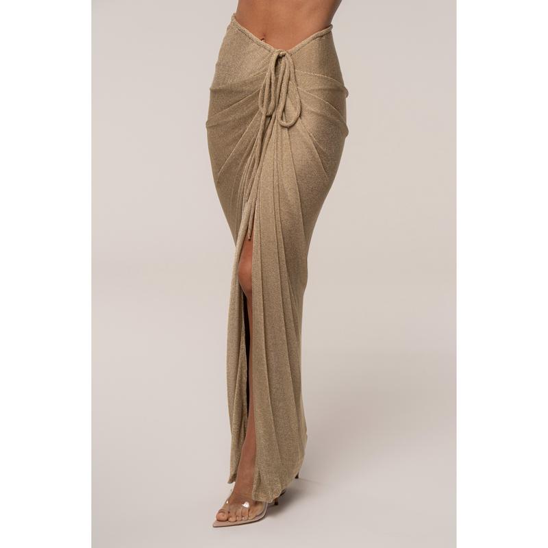 Shimmer in motion with our Gold Noelia Metallic Slit Skirt. We've redesigned our most-loved silhouette, now with a new shine. Crafted from a shimmering metallic knit fabric, this maxi skirt features our signature rope drawstring, flattering draping, and a side slit—bringing bold elegance to every moment. Pair with our Nocturne Draped Top for the full look. Double lined. Minimal stretch. Not sold as set.