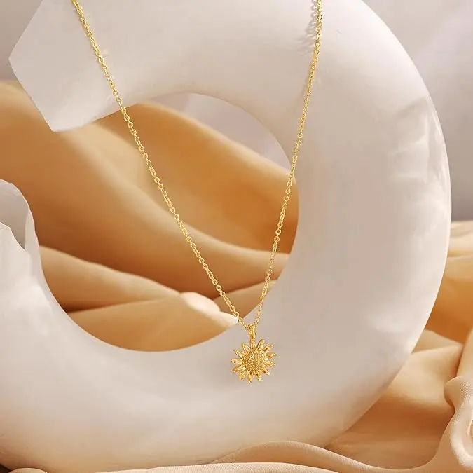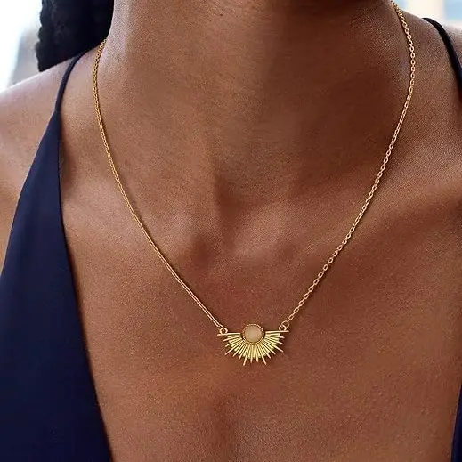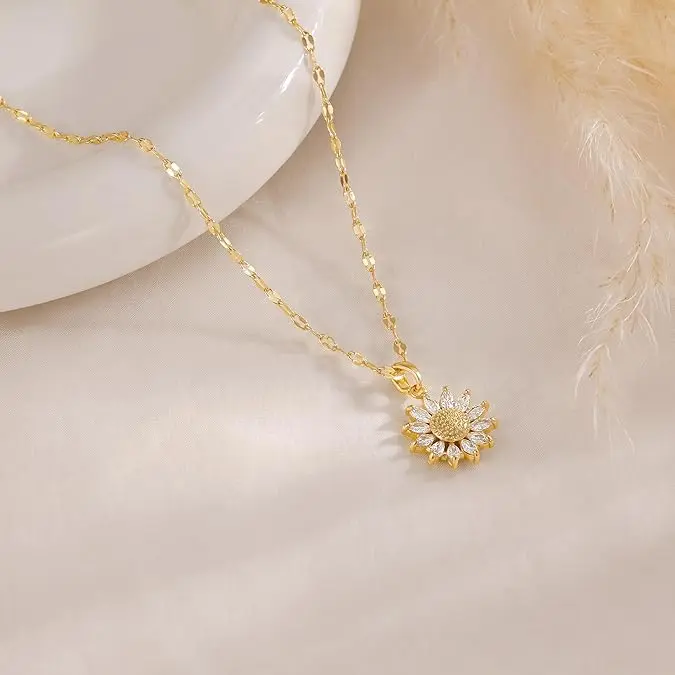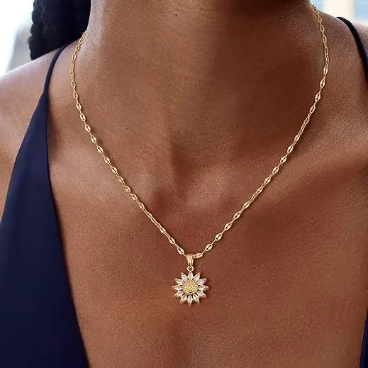 5. Tewiky Gold Pendant Necklace for Women, Gold Cubic Zirconia Dainty Sun and Moon Necklace Cute Minimalist Diamond Gemstone Turquoise Chain Choker Sunflower Necklace Jewelry Gifts for Women