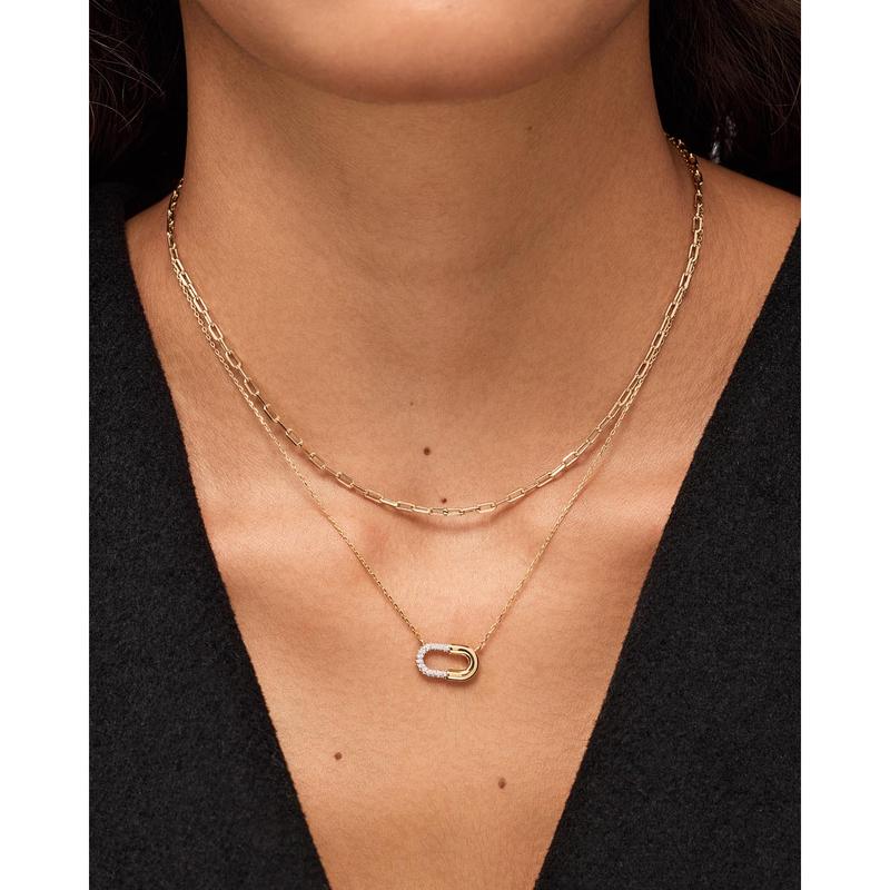This gold pendant is the finishing touch you’ve been searching for. Plated in 14k gold and rhodium, this pavé pendant features a dainty chain and a tubular pendant adorned with cubic zirconia gemstones for an eye-catching touch of sparkle. Pair this pendant necklace with our slim Laura necklace for a timeless yet bold look.