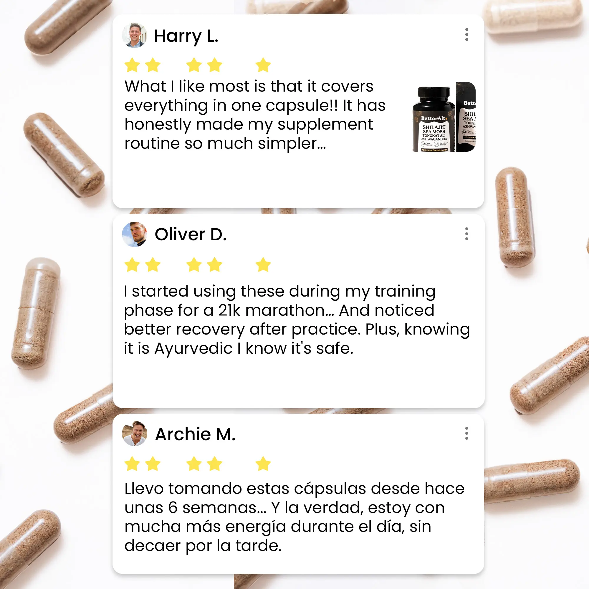 ·These capsules contain Shilajit, Ashwagandha, Maca root, Gingko Biloba, Panax Ginseng, Sea Moss, and Safed Musli along with other herbs.