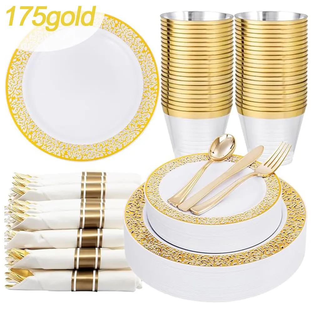 175 PCS Silver/Gold Dinnerware Set Include:25 Dinner Plates, 25 Dessert Plate, 75 Pcs Gold Plastic Silverware, 25 Cups for Party