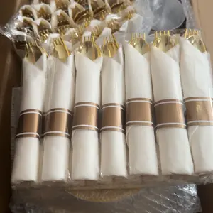 350 PCS ClearGold: Plastic Plates Disposable Gold Cutlery Dinnerware set for party: 50 Dinner Plate, 50 Dessert Plate, 50 Per Rolled Napkins with Gold Silverware, 50 Cups 9 OZ for Wedding & Party