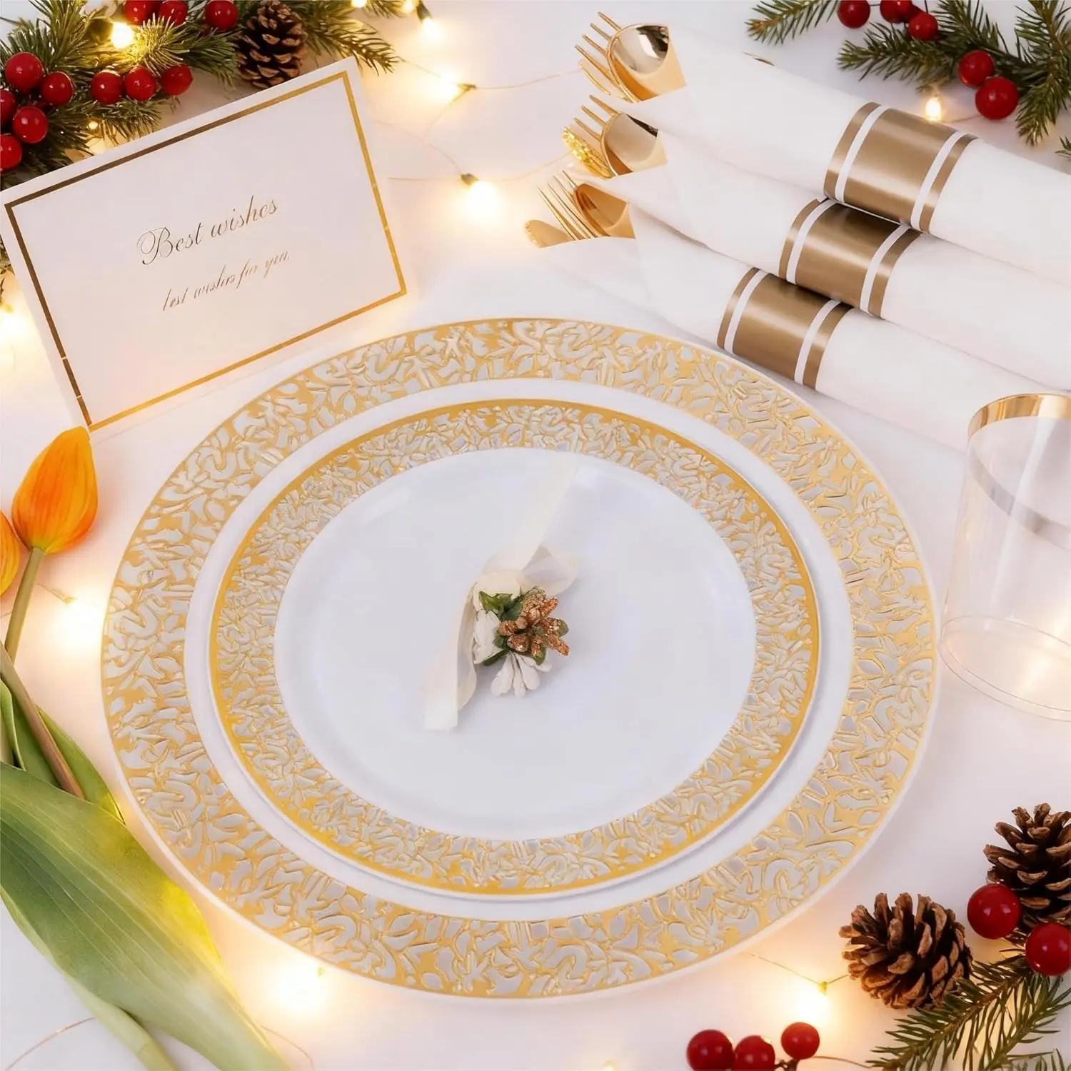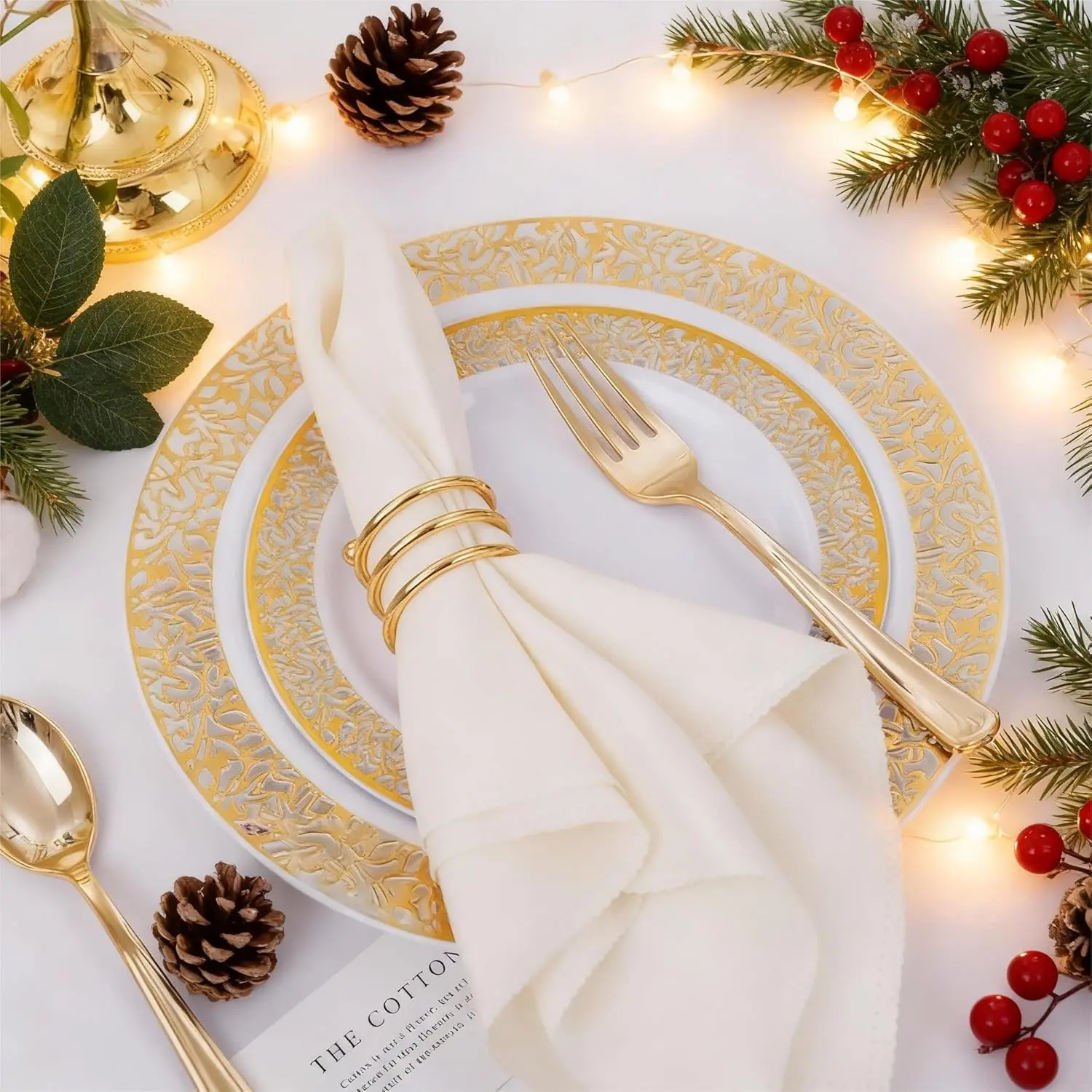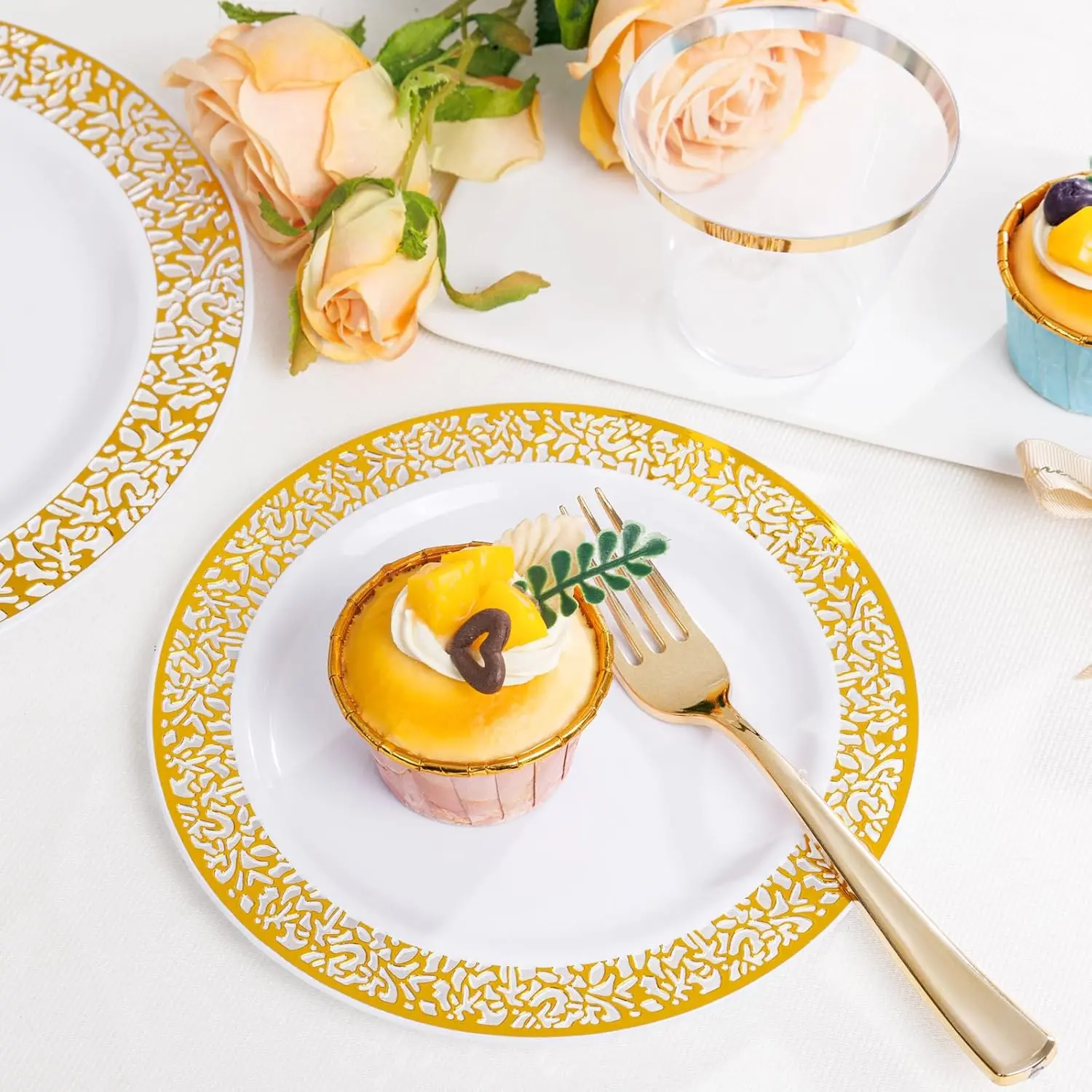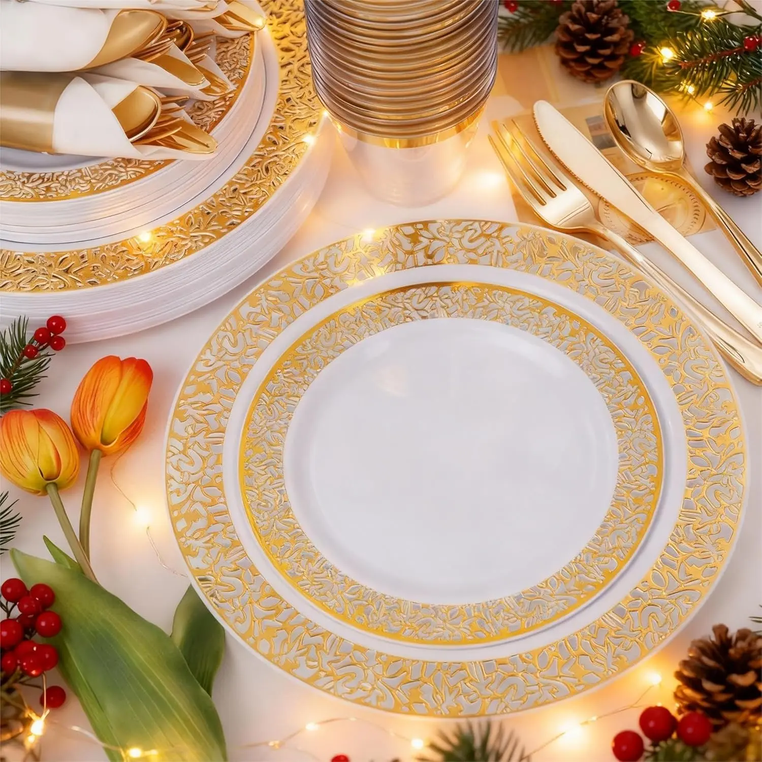 350 PCS White: Plastic Plates Disposable Gold Cutlery Dinnerware set for party: 50 Dinner Plate, 50 Dessert Plate, 50 Per Rolled Napkins with Gold Silverware, 50 Cups 9 OZ for Wedding & Party